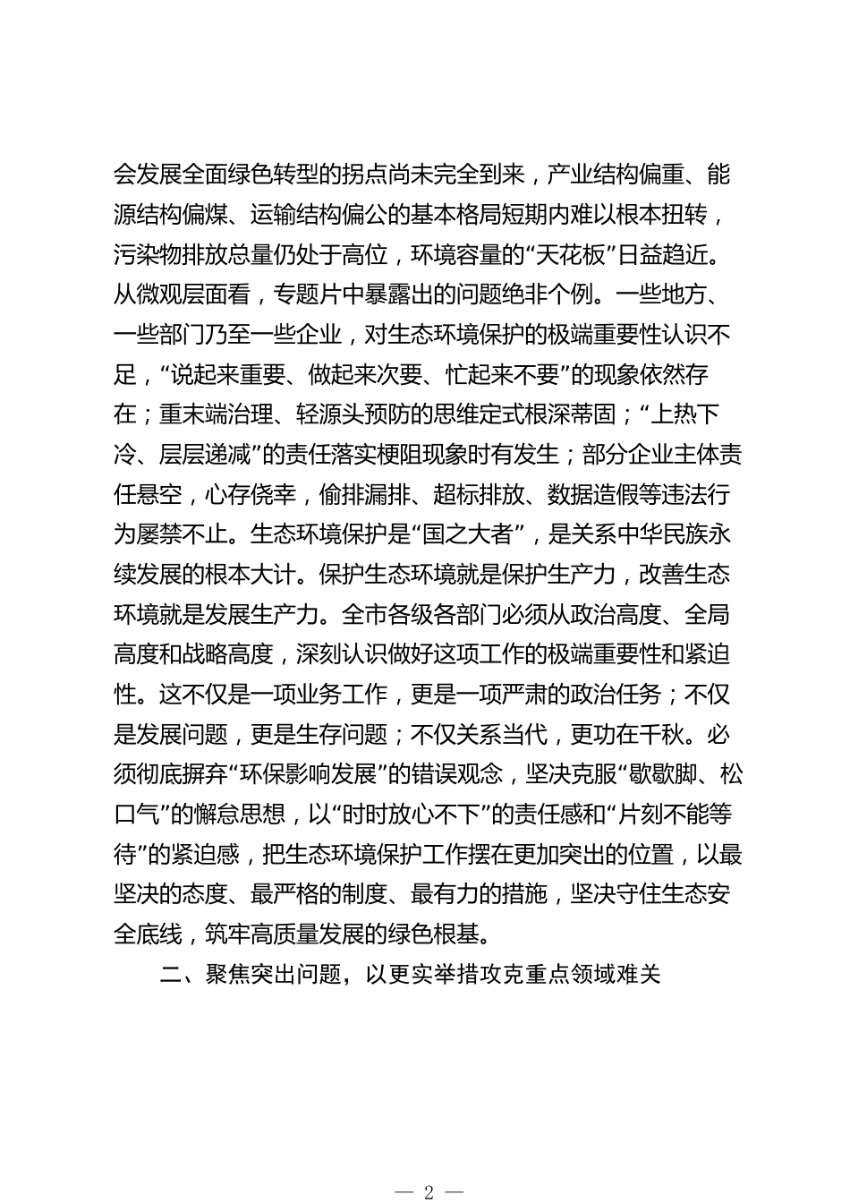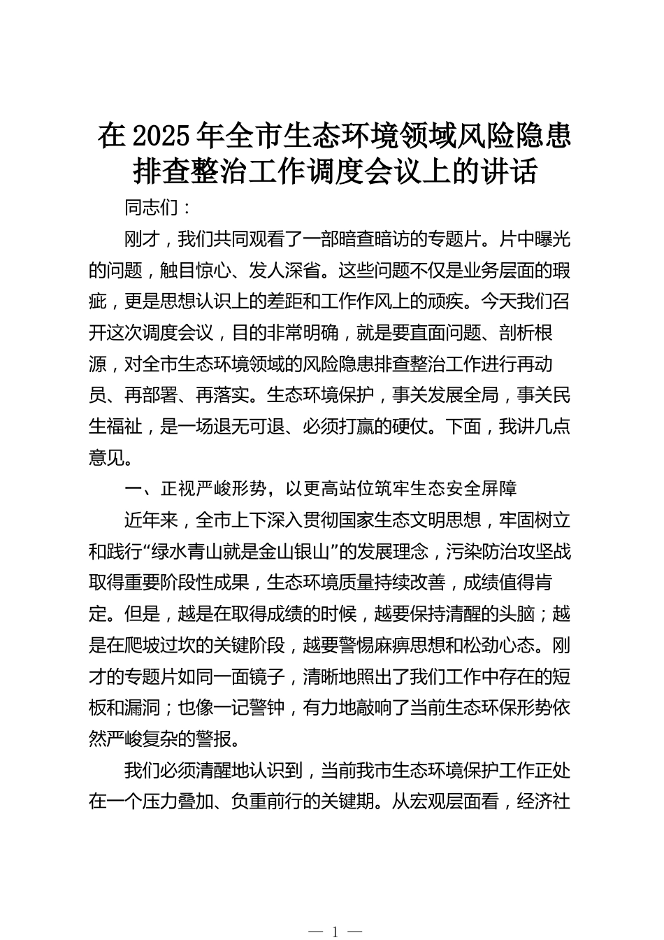 在2025年全市生態(tài)環(huán)境領域風險隱患排查整治工作調度會議上的講話同志們:剛才,我們共同觀看了一部暗查暗訪的專題片。片中曝光的問題,觸目驚心、發(fā)人深省。這些問題不僅是業(yè)務層面的瑕疵,更是思想認識上的差距和工作作風上的頑疾。今天我們召開這次調度會議,目的非常明確,就是要直面問題、剖析根源,對全市生態(tài)環(huán)境領域的風險隱患排查整治工作進行再動員、再部署、再落實。生態(tài)環(huán)境保護,事關發(fā)展全局,事關民生福祉,是一場退無可退、必須打贏的硬仗。下面,我講幾點意見。一、正視嚴峻形勢,以更高站位筑牢生態(tài)安全屏障近年來,全市上下深入貫徹國家生態(tài)文明思想,...