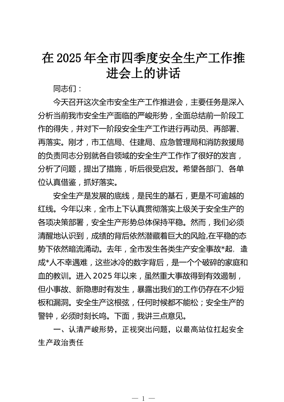 在2025年全市四季度安全生產(chǎn)工作推進(jìn)會(huì)上的講話