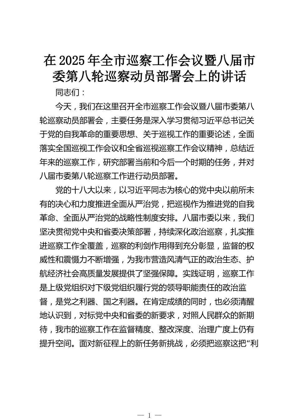 在2025年全市巡察工作會(huì)議暨八屆市委第八輪巡察動(dòng)員部署會(huì)上的講話