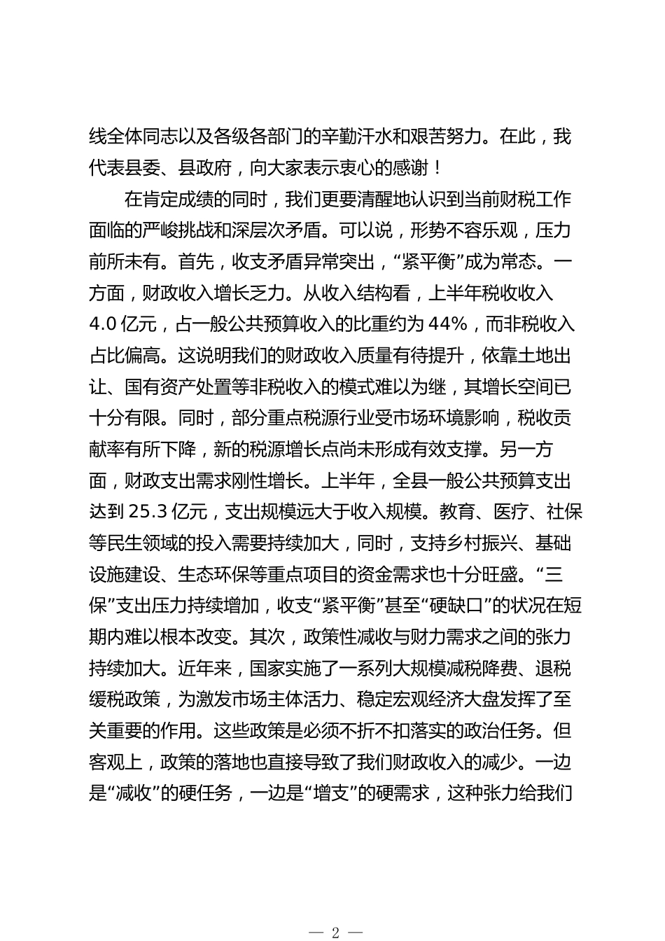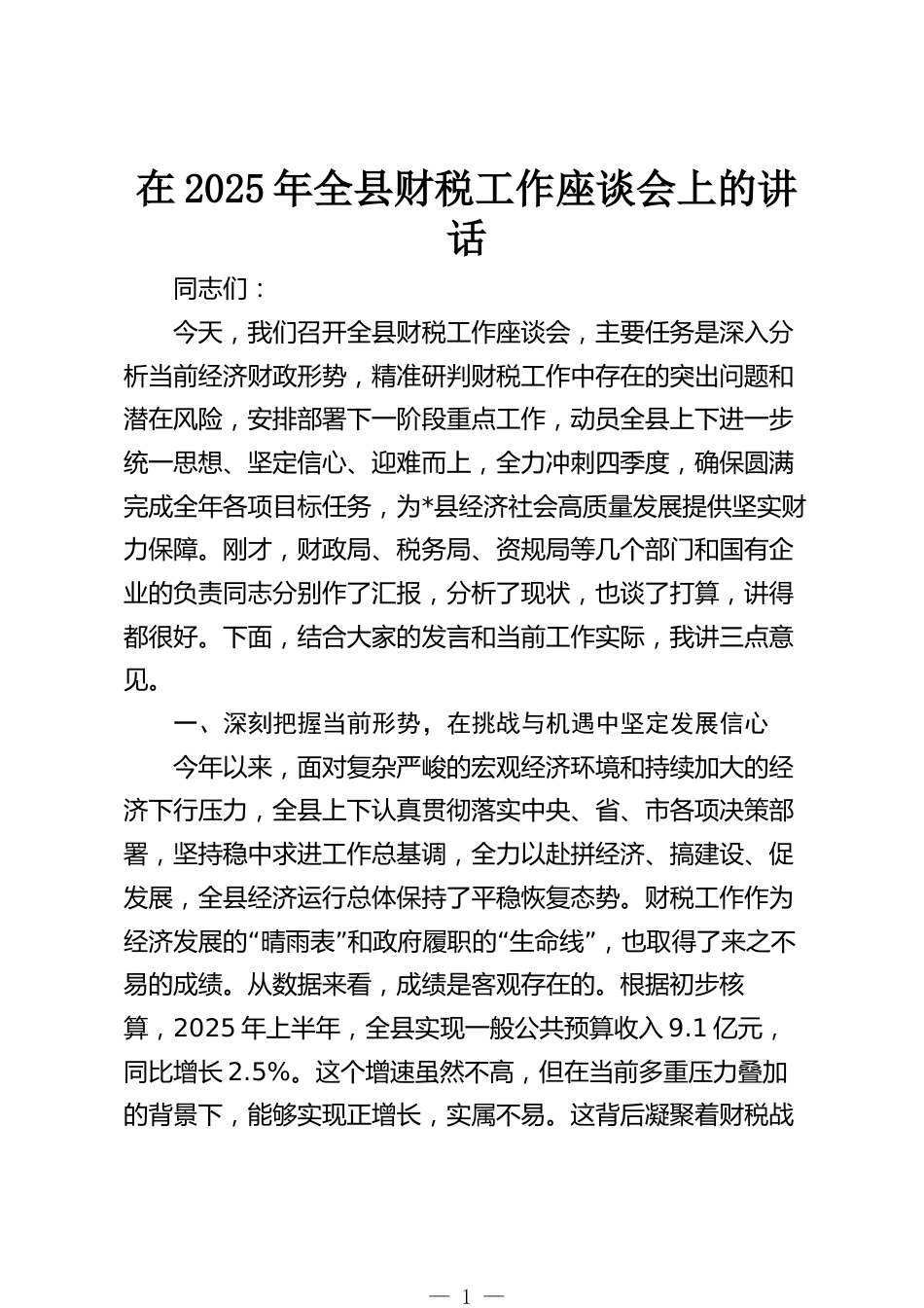 在2025年全縣財稅工作座談會上的講話同志們:今天,我們召開全縣財稅工作座談會,主要任務(wù)是深入分析當(dāng)前經(jīng)濟財政形勢,精準(zhǔn)研判財稅工作中存在的突出問題和潛在風(fēng)險,安排部署下一階段重點工作,動員全縣上下進一步統(tǒng)一思想、堅定信心、迎難而上,全力沖刺四季度,確保圓滿完成全年各項目標(biāo)任務(wù),為*縣經(jīng)濟社會高質(zhì)量發(fā)展提供堅實財力保障。剛才,財政局、稅務(wù)局、資規(guī)局等幾個部門和國有企業(yè)的負(fù)責(zé)同志分別作了匯報,分析了現(xiàn)狀,也談了打算,講得都很好。下面,結(jié)合大家的發(fā)言和當(dāng)前工作實際,我講三點意見。一、深刻把握當(dāng)前形勢,在挑戰(zhàn)與機遇中堅定發(fā)展信心今年以...