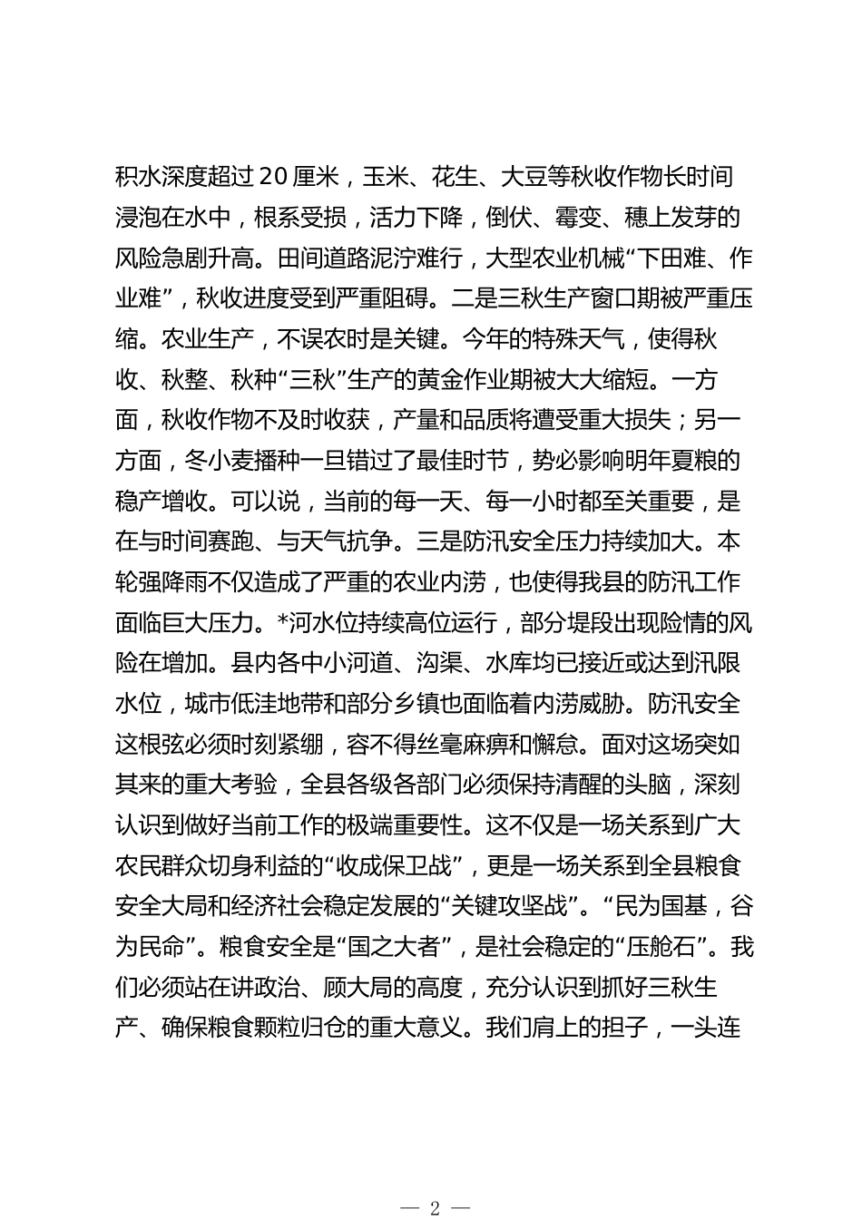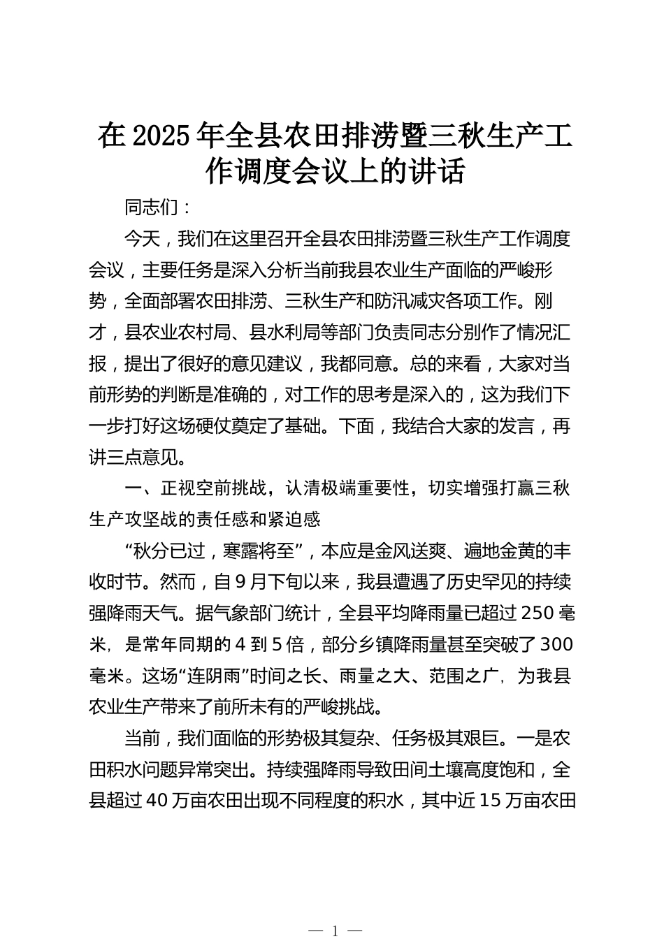 在2025年全縣農(nóng)田排澇暨三秋生產(chǎn)工作調(diào)度會議上的講話同志們:今天,我們在這里召開全縣農(nóng)田排澇暨三秋生產(chǎn)工作調(diào)度會議,主要任務(wù)是深入分析當(dāng)前我縣農(nóng)業(yè)生產(chǎn)面臨的嚴(yán)峻形勢,全面部署農(nóng)田排澇、三秋生產(chǎn)和防汛減災(zāi)各項(xiàng)工作。剛才,縣農(nóng)業(yè)農(nóng)村局、縣水利局等部門負(fù)責(zé)同志分別作了情況匯報(bào),提出了很好的意見建議,我都同意。總的來看,大家對當(dāng)前形勢的判斷是準(zhǔn)確的,對工作的思考是深入的,這為我們下一步打好這場硬仗奠定了基礎(chǔ)。下面,我結(jié)合大家的發(fā)言,再講三點(diǎn)意見。一、正視空前挑戰(zhàn),認(rèn)清極端重要性,切實(shí)增強(qiáng)打贏三秋生產(chǎn)攻堅(jiān)戰(zhàn)的責(zé)任感和緊迫感“”秋分已過,...