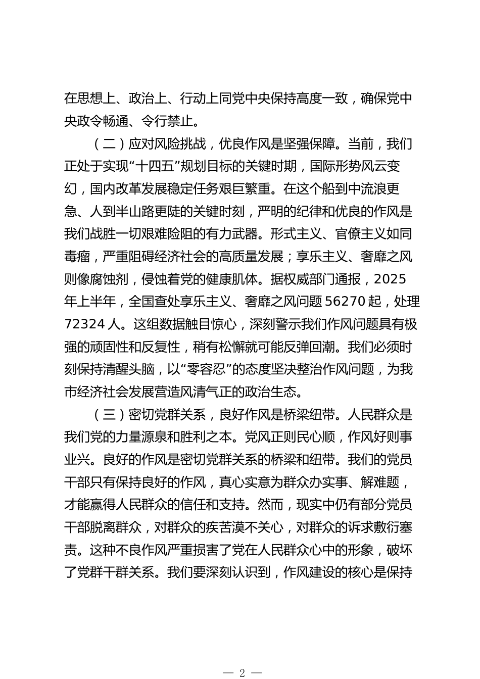 在2025年市委黨建、黨風(fēng)廉政建設(shè)領(lǐng)導(dǎo)小組會議上的講話同志們:自黨的十八大以來,以習(xí)近平同志為核心的黨中央以刮骨療毒的決心和雷霆萬鈞的力度,堅定不移推進全面從嚴(yán)治黨。曾經(jīng)那些看似積重難返的不良風(fēng)氣得到有效遏制,一系列長期存在的頑瘴痼疾得到有力整治,黨風(fēng)政風(fēng)煥然一新,社風(fēng)民風(fēng)向上向善。今年,黨中央決定在全黨進一步深化作風(fēng)建設(shè),這充分彰顯了黨中央持之以恒正風(fēng)肅紀(jì)的堅定意志和如磐決心。我們必須站在政治和全局的高度,深刻領(lǐng)會其重大意義和豐富內(nèi)涵。一、強化政治擔(dān)當(dāng),深刻領(lǐng)悟作風(fēng)建設(shè)深化之要義“”(一)踐行兩個維護,作風(fēng)建設(shè)是政治檢驗。作風(fēng)...