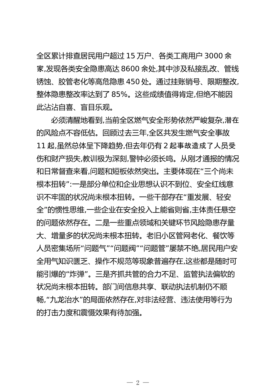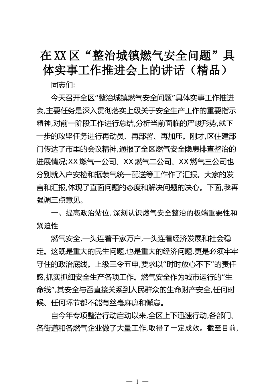 在XX區(qū)“整治城鎮(zhèn)燃氣安全問題”具體實事工作推進會上的講話(精品)同志們:“”今天召開全區(qū)整治城鎮(zhèn)燃氣安全問題具體實事工作推進會,主要任務(wù)是深入貫徹落實上級關(guān)于安全生產(chǎn)工作的重要指示精神,對前一階段工作進行總結(jié),分析當(dāng)前面臨的嚴(yán)峻形勢,就下一步的攻堅任務(wù)進行再動員、再部署、再加壓。剛才,區(qū)住建部門傳達了市里的會議精神,通報了全區(qū)燃氣安全隱患排查整治的進展情況;XX燃氣一公司、XX燃氣二公司、XX燃氣三公司也分別就入戶安檢和瓶裝氣統(tǒng)一配送等工作作了匯報。大家的發(fā)言和匯報,體現(xiàn)了直面問題的態(tài)度和解決問題的決心。下面,我再強調(diào)三點意見。一、提高政治...