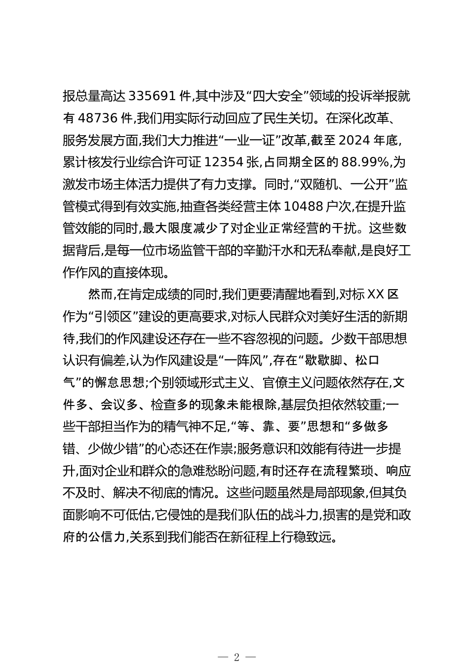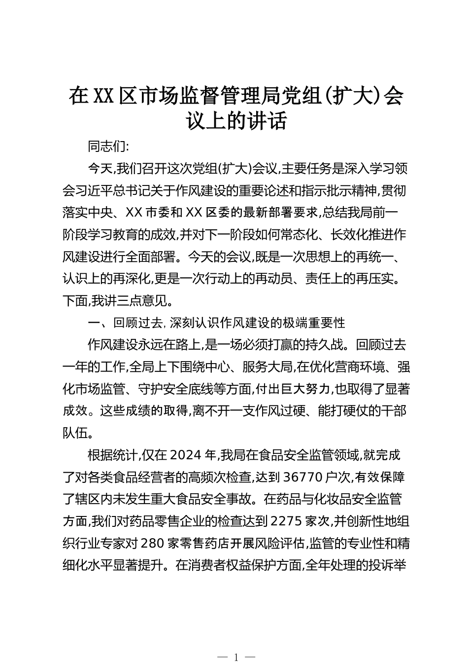 在XX區(qū)市場監(jiān)督管理局黨組(擴(kuò)大)會(huì)議上的講話同志們:今天,我們召開這次黨組(擴(kuò)大)會(huì)議,主要任務(wù)是深入學(xué)習(xí)領(lǐng)會(huì)習(xí)近平總書記關(guān)于作風(fēng)建設(shè)的重要論述和指示批示精神,貫徹落實(shí)中央、XX市委和XX區(qū)委的最新部署要求,總結(jié)我局前一階段學(xué)習(xí)教育的成效,并對(duì)下一階段如何常態(tài)化、長效化推進(jìn)作風(fēng)建設(shè)進(jìn)行全面部署。今天的會(huì)議,既是一次思想上的再統(tǒng)一、認(rèn)識(shí)上的再深化,更是一次行動(dòng)上的再動(dòng)員、責(zé)任上的再壓實(shí)。下面,我講三點(diǎn)意見。一、回顧過去,深刻認(rèn)識(shí)作風(fēng)建設(shè)的極端重要性作風(fēng)建設(shè)永遠(yuǎn)在路上,是一場必須打贏的持久戰(zhàn)?;仡欉^去一年的工作,全局上下圍繞中心、服務(wù)大局,在優(yōu)化營...