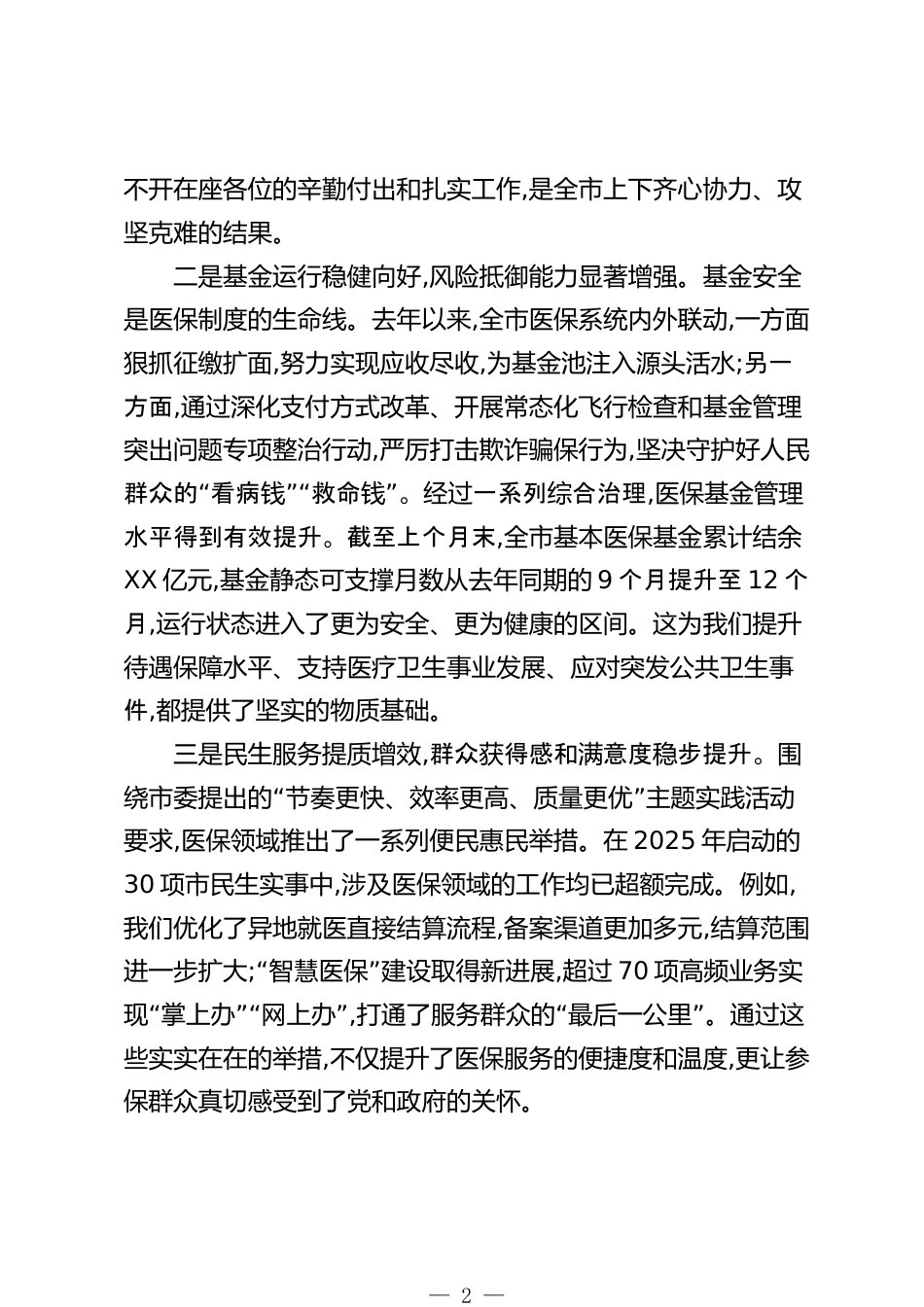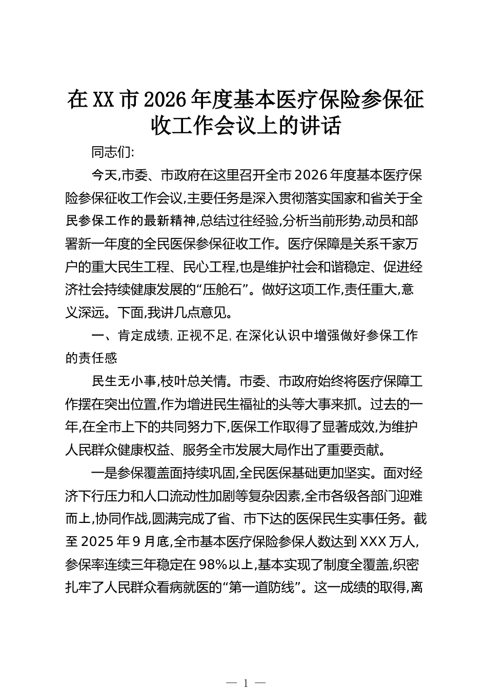 在XX市2026年度基本醫(yī)療保險(xiǎn)參保征收工作會(huì)議上的講話同志們:今天,市委、市政府在這里召開(kāi)全市2026年度基本醫(yī)療保險(xiǎn)參保征收工作會(huì)議,主要任務(wù)是深入貫徹落實(shí)國(guó)家和省關(guān)于全民參保工作的最新精神,總結(jié)過(guò)往經(jīng)驗(yàn),分析當(dāng)前形勢(shì),動(dòng)員和部署新一年度的全民醫(yī)保參保征收工作。醫(yī)療保障是關(guān)系千家萬(wàn)戶的重大民生工程、民心工程,也是維護(hù)社會(huì)和諧穩(wěn)定、促進(jìn)經(jīng)“”濟(jì)社會(huì)持續(xù)健康發(fā)展的壓艙石。做好這項(xiàng)工作,責(zé)任重大,意義深遠(yuǎn)。下面,我講幾點(diǎn)意見(jiàn)。一、肯定成績(jī),正視不足,在深化認(rèn)識(shí)中增強(qiáng)做好參保工作的責(zé)任感民生無(wú)小事,枝葉總關(guān)情。市委、市政府始終將醫(yī)療保障工作擺在突出位...