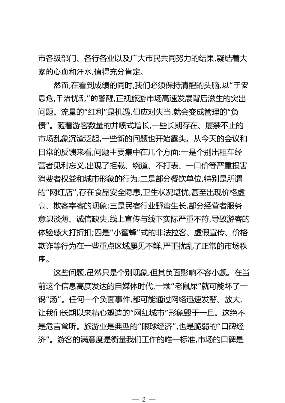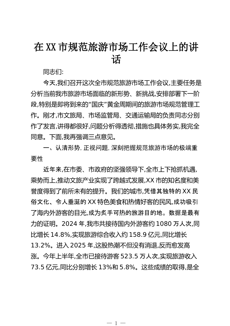 在XX市規(guī)范旅游市場工作會議上的講話同志們:今天,我們召開這次全市規(guī)范旅游市場工作會議,主要任務是分析當前我市旅游市場面臨的新形勢、新挑戰(zhàn),安排部署下一階段,“”特別是即將到來的國慶黃金周期間的旅游市場規(guī)范管理工作。剛才,市文旅局、市場監(jiān)管局、交通運輸局的負責同志分別作了發(fā)言,講得都很好,問題分析得透徹,措施也具體務實,我完全同意。下面,我再強調(diào)三點意見。一、認清形勢,正視問題,深刻把握規(guī)范旅游市場的極端重要性近年來,在市委、市政府的堅強領導下,全市上下?lián)屪C遇,乘勢而上,推動文旅產(chǎn)業(yè)實現(xiàn)了跨越式發(fā)展,XX市的知名度和美譽度得到了前所未有的提升。...