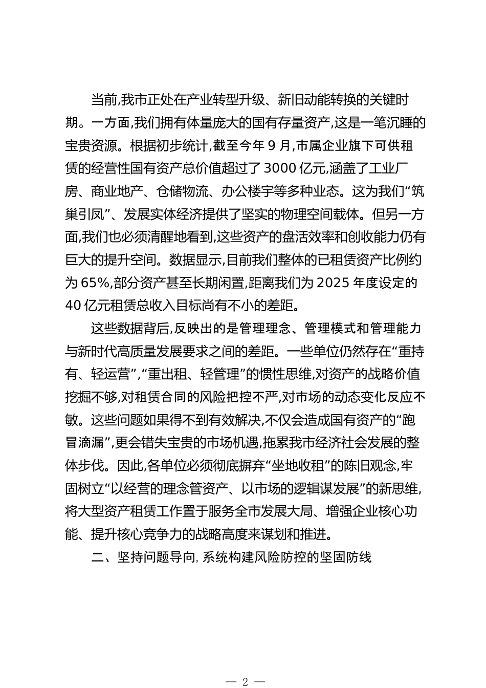 在XX市國資委大型資產(chǎn)租賃合同管理座談會上的講話(精品)同志們:今天,我們組織召開這次大型資產(chǎn)租賃合同管理座談會,主題鮮明、意義重大。剛才,相關(guān)科室的同志分析了當(dāng)前工作中存在的共性問題與潛在風(fēng)險,市屬XX集團、XX公司等單位的負責(zé)同志也結(jié)合各自實踐,分享了經(jīng)驗、剖析了挑戰(zhàn)、提出了對策,講得都很好,具有很強的針對性和啟發(fā)性。國有資產(chǎn)是全體人民的共同財富,是推進國家現(xiàn)代化、保障人民共同利益的重要物質(zhì)基礎(chǔ)。大型資產(chǎn)租賃,作為盤活存量資產(chǎn)、提升資源配置效率、實現(xiàn)國有資本保值增值的重要路徑,其管理水平直接關(guān)系到國有資產(chǎn)的權(quán)益與安全,關(guān)系到市屬國有企業(yè)的...