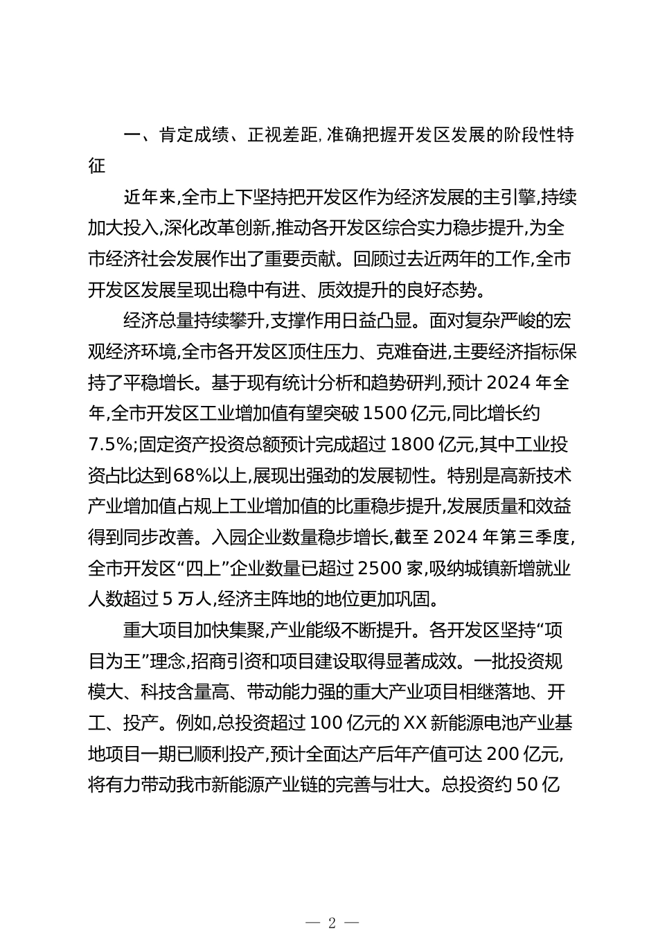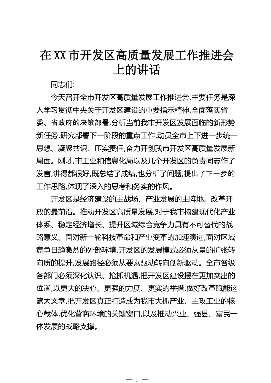 在XX市開發(fā)區(qū)高質量發(fā)展工作推進會上的講話同志們:今天召開全市開發(fā)區(qū)高質量發(fā)展工作推進會,主要任務是深入學習貫徹中央關于開發(fā)區(qū)建設的重要指示精神,全面落實省委、省政府的決策部署,分析當前我市開發(fā)區(qū)發(fā)展面臨的新形勢新任務,研究部署下一階段的重點工作,動員全市上下進一步統(tǒng)一思想、凝聚共識、壓實責任,奮力開創(chuàng)我市開發(fā)區(qū)高質量發(fā)展新局面。剛才,市工業(yè)和信息化局以及幾個開發(fā)區(qū)的負責同志作了發(fā)言,講得都很好,既總結了成績,也分析了問題,提出了下一步的工作思路,體現(xiàn)了深入的思考和務實的作風。開發(fā)區(qū)是經濟建設的主戰(zhàn)場、產業(yè)發(fā)展的主陣地、改革開放的最前沿。...