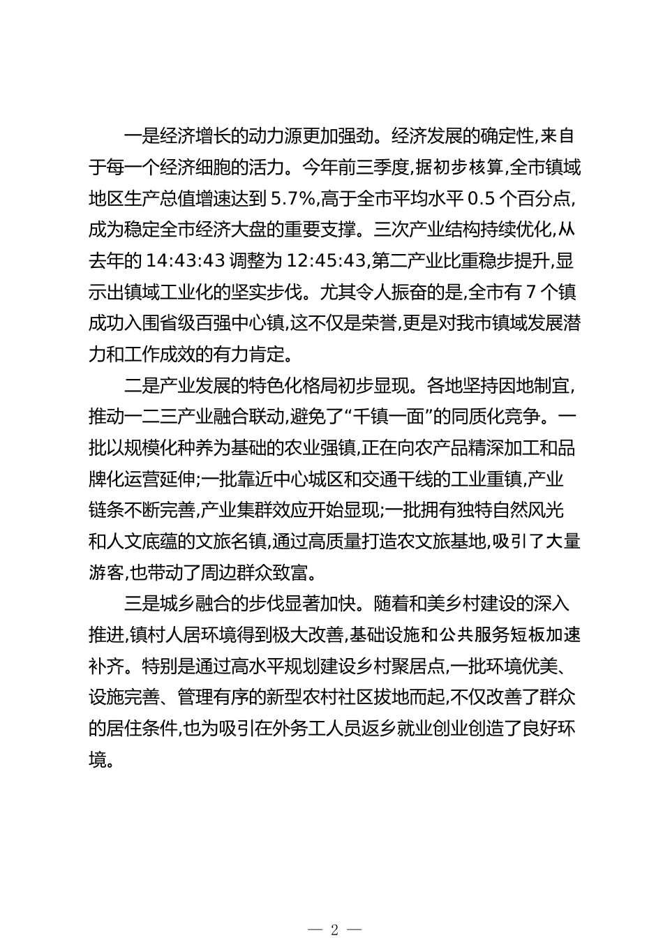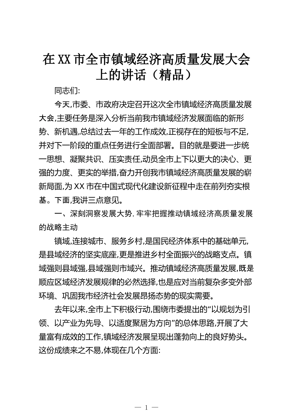 在XX市全市鎮(zhèn)域經(jīng)濟(jì)高質(zhì)量發(fā)展大會(huì)上的講話(精品)同志們:今天,市委、市政府決定召開(kāi)這次全市鎮(zhèn)域經(jīng)濟(jì)高質(zhì)量發(fā)展大會(huì),主要任務(wù)是深入分析當(dāng)前我市鎮(zhèn)域經(jīng)濟(jì)發(fā)展面臨的新形勢(shì)、新機(jī)遇,總結(jié)過(guò)去一年的工作成效,正視存在的短板與不足,并對(duì)下一階段的重點(diǎn)任務(wù)進(jìn)行全面部署。目的就是要進(jìn)一步統(tǒng)一思想、凝聚共識(shí)、壓實(shí)責(zé)任,動(dòng)員全市上下以更大的決心、更強(qiáng)的力度、更實(shí)的舉措,奮力開(kāi)創(chuàng)我市鎮(zhèn)域經(jīng)濟(jì)高質(zhì)量發(fā)展的嶄新局面,為XX市在中國(guó)式現(xiàn)代化建設(shè)新征程中走在前列夯實(shí)根基。下面,我講三點(diǎn)意見(jiàn)。一、深刻洞察發(fā)展大勢(shì),牢牢把握推動(dòng)鎮(zhèn)域經(jīng)濟(jì)高質(zhì)量發(fā)展的戰(zhàn)略主動(dòng)鎮(zhèn)域,連接城市、...