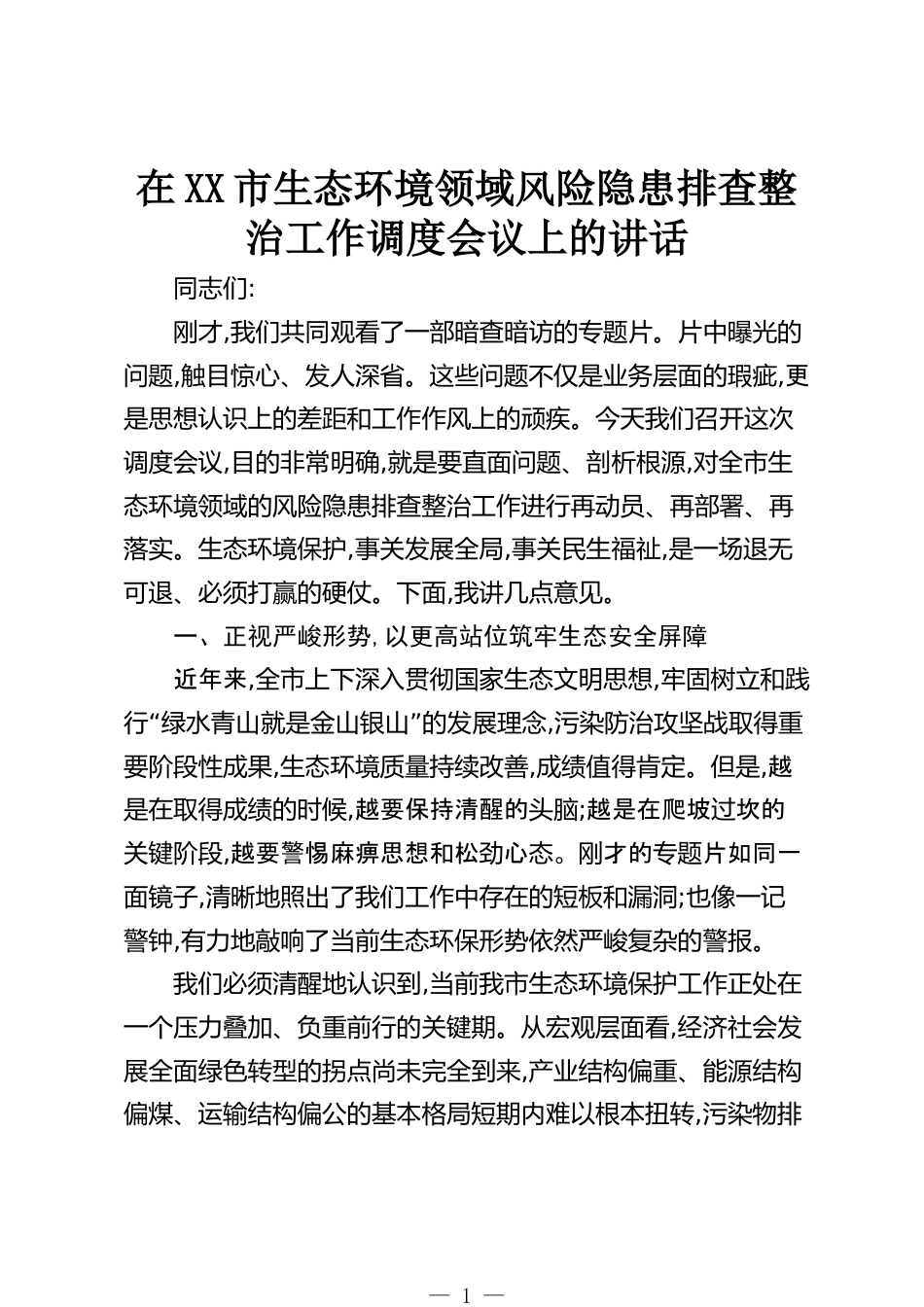 在XX市生態(tài)環(huán)境領(lǐng)域風(fēng)險(xiǎn)隱患排查整治工作調(diào)度會(huì)議上的講話