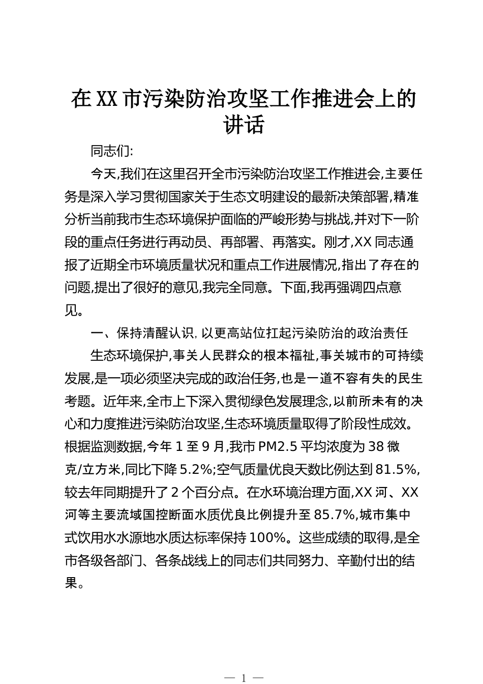 在XX市污染防治攻堅(jiān)工作推進(jìn)會(huì)上的講話同志們:今天,我們?cè)谶@里召開全市污染防治攻堅(jiān)工作推進(jìn)會(huì),主要任務(wù)是深入學(xué)習(xí)貫徹國家關(guān)于生態(tài)文明建設(shè)的最新決策部署,精準(zhǔn)分析當(dāng)前我市生態(tài)環(huán)境保護(hù)面臨的嚴(yán)峻形勢(shì)與挑戰(zhàn),并對(duì)下一階段的重點(diǎn)任務(wù)進(jìn)行再動(dòng)員、再部署、再落實(shí)。剛才,XX同志通報(bào)了近期全市環(huán)境質(zhì)量狀況和重點(diǎn)工作進(jìn)展情況,指出了存在的問題,提出了很好的意見,我完全同意。下面,我再強(qiáng)調(diào)四點(diǎn)意見。一、保持清醒認(rèn)識(shí),以更高站位扛起污染防治的政治責(zé)任生態(tài)環(huán)境保護(hù),事關(guān)人民群眾的根本福祉,事關(guān)城市的可持續(xù)發(fā)展,是一項(xiàng)必須堅(jiān)決完成的政治任務(wù),也是一道不容有失的民生考...