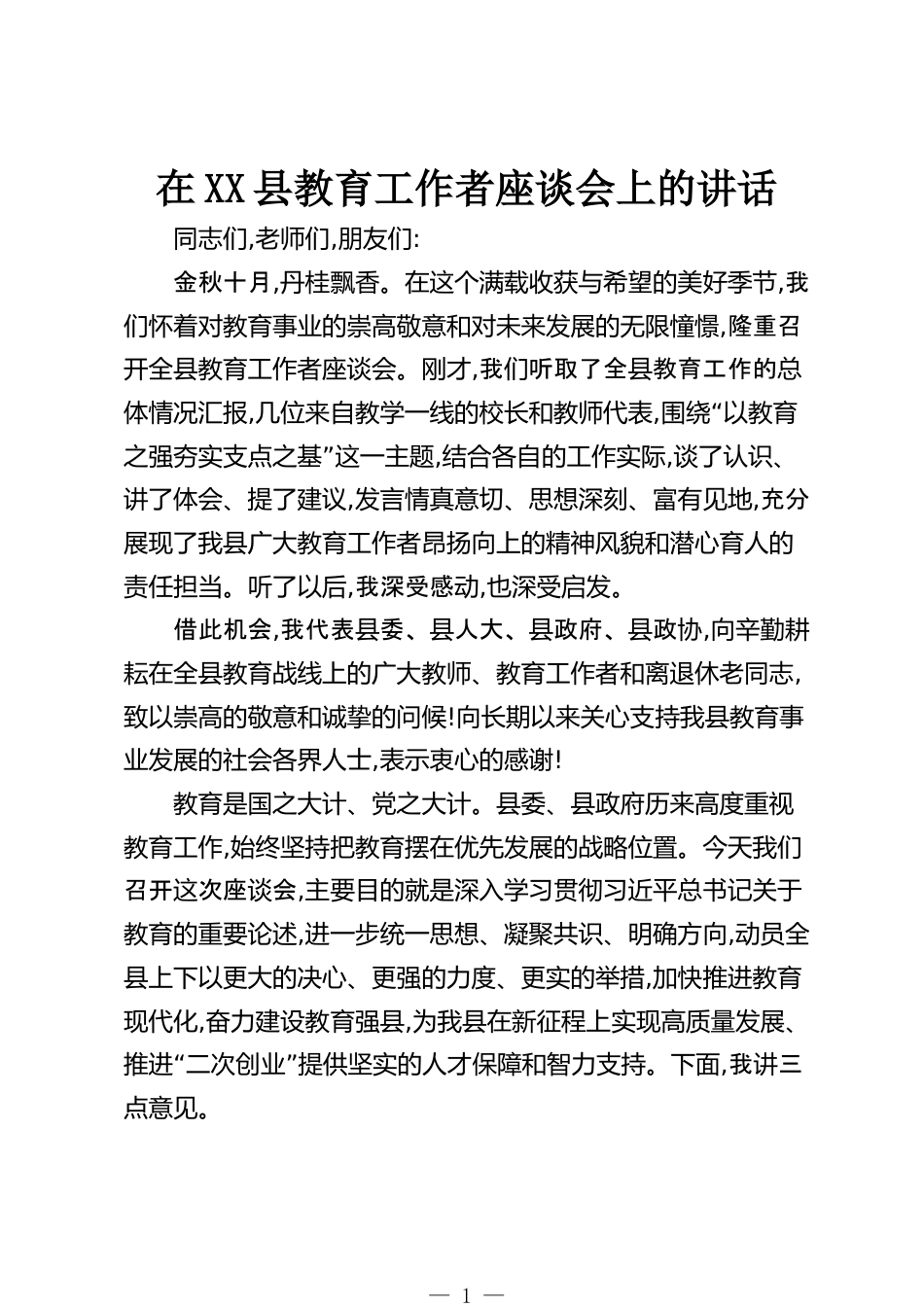 在XX縣教育工作者座談會(huì)上的講話同志們,老師們,朋友們:金秋十月,丹桂飄香。在這個(gè)滿載收獲與希望的美好季節(jié),我們懷著對(duì)教育事業(yè)的崇高敬意和對(duì)未來(lái)發(fā)展的無(wú)限憧憬,隆重召開(kāi)全縣教育工作者座談會(huì)。剛才,我聽(tīng)取了全教育工作的們縣總體情況匯報(bào),幾位來(lái)自教學(xué)一線的校長(zhǎng)和教師代表,“圍繞以教育”之強(qiáng)夯實(shí)支點(diǎn)之基這一主題,結(jié)合各自的工作實(shí)際,談了認(rèn)識(shí)、講了體會(huì)、提了建議,發(fā)言情真意切、思想深刻、富有見(jiàn)地,充分展現(xiàn)了我縣廣大教育工作者昂揚(yáng)向上的精神風(fēng)貌和潛心育人的責(zé)任擔(dān)當(dāng)。聽(tīng)了以后,我深受感動(dòng),也深受啟發(fā)。借此機(jī)會(huì),我代表委、人大、政府、政縣縣縣縣協(xié),向辛勤耕...