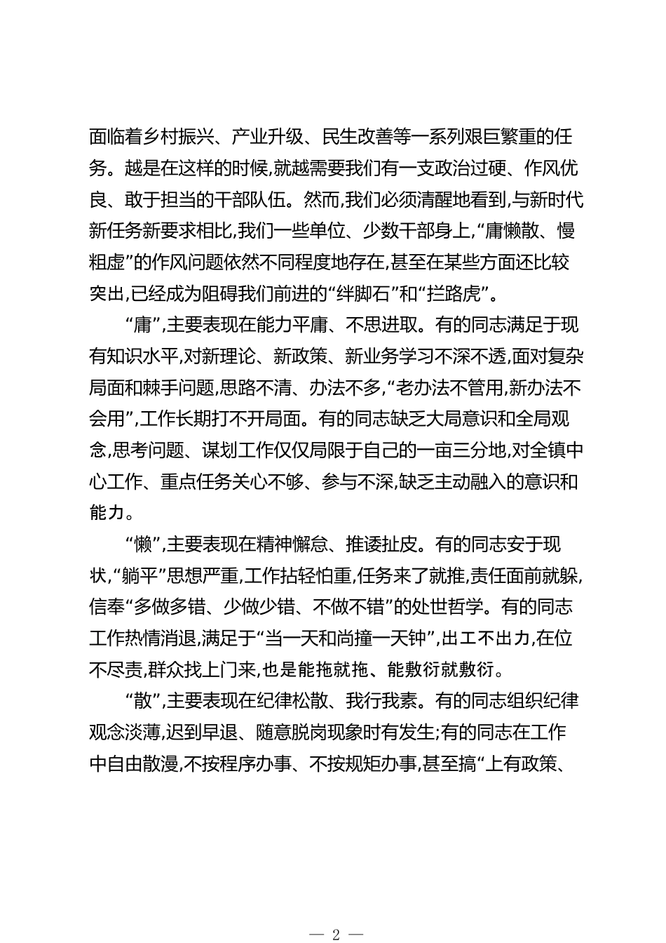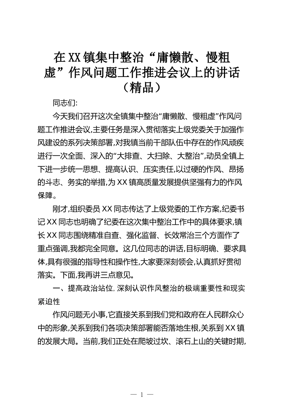 在XX鎮(zhèn)集中整治“庸懶散、慢粗虛”作風問題工作推進會議上的講話(精品)同志們:“”今天我們召開這次全鎮(zhèn)集中整治庸懶散、慢粗虛作風問題工作推進會議,主要任務是深入貫徹落實上級黨委關于加強作風建設的系列決策部署,對我鎮(zhèn)當前干部隊伍中存在的作風頑疾“”進行一次全面、深入的大排查、大掃除、大整治,動員全鎮(zhèn)上下進一步統(tǒng)一思想、提高認識、壓實責任,以過硬的作風、昂揚的斗志、務實的舉措,為XX鎮(zhèn)高質量發(fā)展提供堅強有力的作風保障。剛才,組織委員XX同志傳達了上級黨委的工作方案,紀委書記XX同志也明確了紀委在這次集中整治工作中的具體要求,鎮(zhèn)長XX同志圍繞精準自...