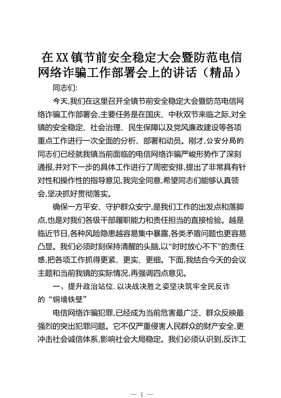 在XX鎮(zhèn)節(jié)前安全穩(wěn)定大會(huì)暨防范電信網(wǎng)絡(luò)詐騙工作部署會(huì)上的講話(精品)