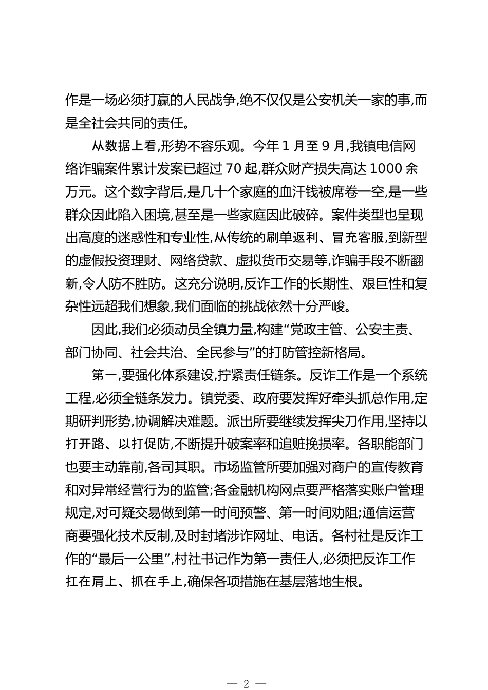 在XX鎮(zhèn)節(jié)前安全穩(wěn)定大會(huì)暨防范電信網(wǎng)絡(luò)詐騙工作部署會(huì)上的講話(精品)同志們:今天,我們?cè)谶@里召開(kāi)全鎮(zhèn)節(jié)前安全穩(wěn)定大會(huì)暨防范電信網(wǎng)絡(luò)詐騙工作部署會(huì),主要任務(wù)是在國(guó)慶、中秋雙節(jié)來(lái)臨之際,對(duì)全鎮(zhèn)的安全穩(wěn)定、社會(huì)治理、民生保障以及黨風(fēng)廉政建設(shè)等各項(xiàng)重點(diǎn)工作進(jìn)行一次全面的分析、部署和動(dòng)員。剛才,公安分局的同志們已經(jīng)就我鎮(zhèn)當(dāng)前面臨的電信網(wǎng)絡(luò)詐騙嚴(yán)峻形勢(shì)作了深刻通報(bào),并對(duì)下一步的具體工作進(jìn)行了周密安排,提出了非常具有針對(duì)性和操作性的指導(dǎo)意見(jiàn),我完全同意,希望同志們能夠認(rèn)真領(lǐng)會(huì),堅(jiān)決抓好貫徹落實(shí)。確保一方平安、守護(hù)群眾安寧,是我們工作的出發(fā)點(diǎn)和落腳點(diǎn),也...