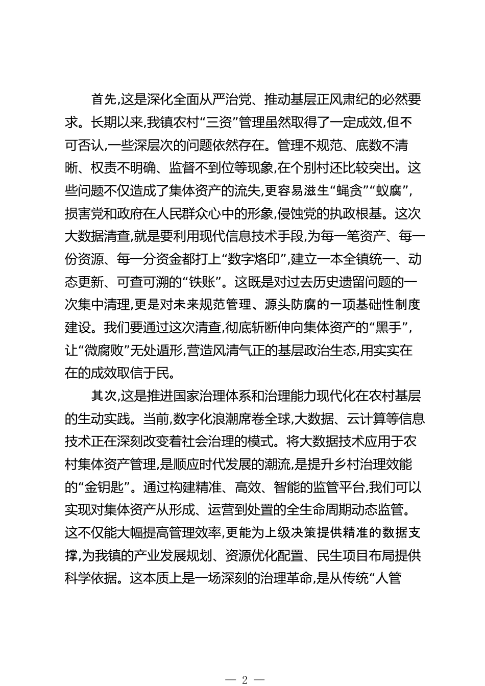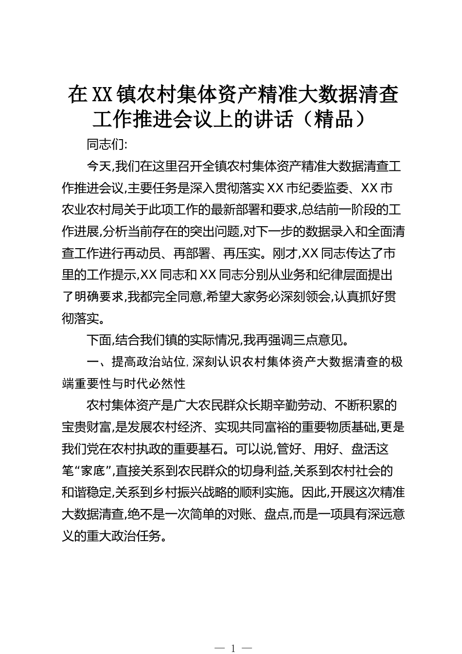 在XX鎮(zhèn)農(nóng)村集體資產(chǎn)精準(zhǔn)大數(shù)據(jù)清查工作推進(jìn)會議上的講話(精品)同志們:今天,我們在這里召開全鎮(zhèn)農(nóng)村集體資產(chǎn)精準(zhǔn)大數(shù)據(jù)清查工作推進(jìn)會議,主要任務(wù)是深入貫徹落實(shí)XX市紀(jì)委監(jiān)委、XX市農(nóng)業(yè)農(nóng)村局關(guān)于此項(xiàng)工作的最新部署和要求,總結(jié)前一階段的工作進(jìn)展,分析當(dāng)前存在的突出問題,對下一步的數(shù)據(jù)錄入和全面清查工作進(jìn)行再動員、再部署、再壓實(shí)。剛才,XX同志傳達(dá)了市里的工作提示,XX同志和XX同志分別從業(yè)務(wù)和紀(jì)律層面提出了明確要求,我都完全同意,希望大家務(wù)必深刻領(lǐng)會,認(rèn)真抓好貫徹落實(shí)。下面,結(jié)合我們鎮(zhèn)的實(shí)際情況,我再強(qiáng)調(diào)三點(diǎn)意見。一、提高政治站位,深刻認(rèn)識農(nóng)村集體資產(chǎn)大...