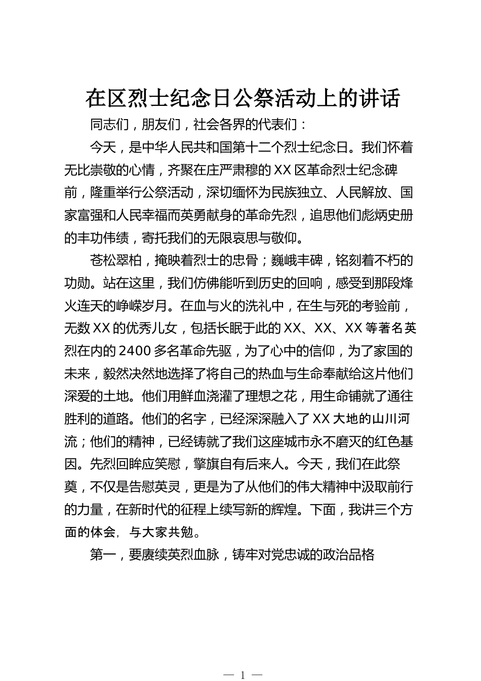 在區(qū)烈士紀念日公祭活動上的講話同志們,朋友們,社會各界的代表們:今天,是中華人民共和國第十二個烈士紀念日。我們懷著無比崇敬的心情,齊聚在莊嚴肅穆的XX區(qū)革命烈士紀念碑前,隆重舉行公祭活動,深切緬懷為民族獨立、人民解放、國家富強和人民幸福而英勇獻身的革命先烈,追思他們彪炳史冊的豐功偉績,寄托我們的無限哀思與敬仰。蒼松翠柏,掩映著烈士的忠骨;巍峨豐碑,銘刻著不朽的功勛。站在這里,我們仿佛能聽到歷史的回響,感受到那段烽火連天的崢嶸歲月。在血與火的洗禮中,在生與死的考驗前,無數(shù)XX的優(yōu)秀兒女,包括長眠于此的XX、XX、XX等著名英烈在內(nèi)的2400...