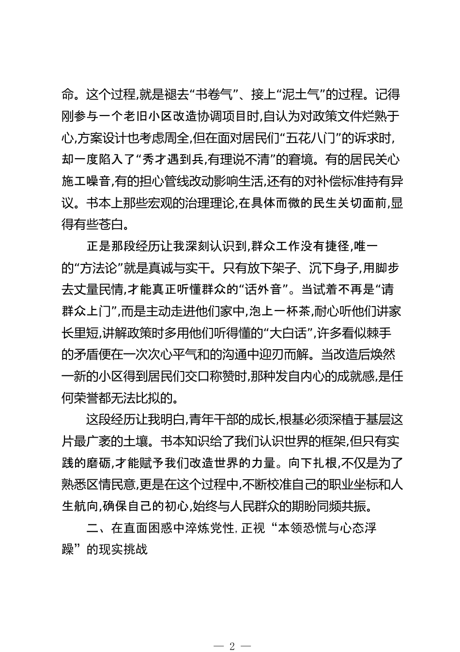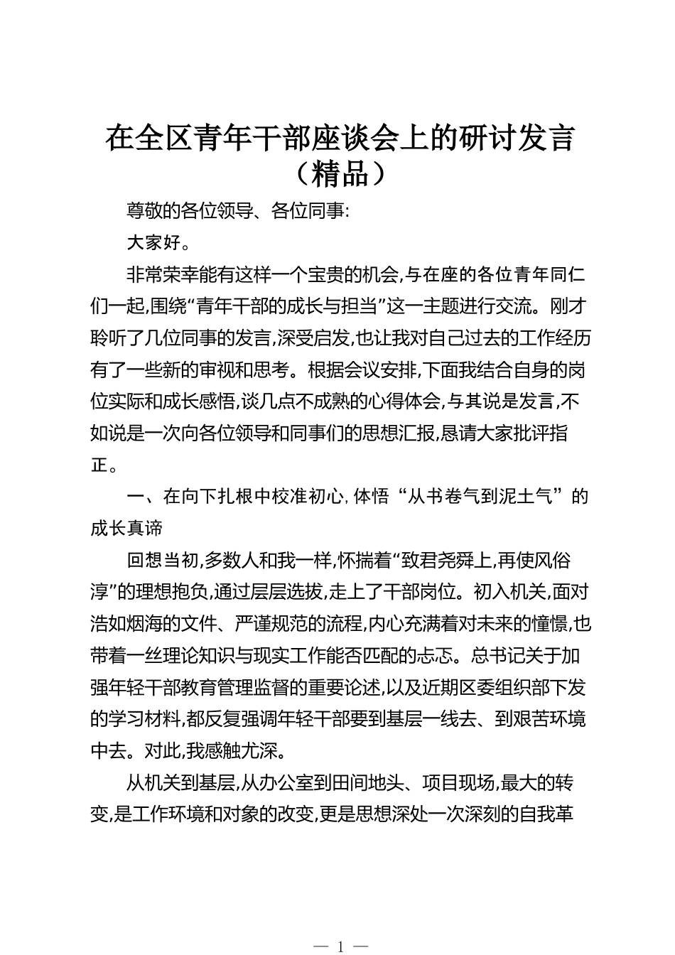 在全區(qū)青年干部座談會(huì)上的研討發(fā)言(精品)尊敬的各位領(lǐng)導(dǎo)、各位同事:大家好。非常榮幸能有這樣一個(gè)寶貴的機(jī)會(huì),與在座的各位青年同仁們一起,“”圍繞青年干部的成長(zhǎng)與擔(dān)當(dāng)這一主題進(jìn)行交流。剛才聆聽(tīng)了幾位同事的發(fā)言,深受啟發(fā),也讓我對(duì)自己過(guò)去的工作經(jīng)歷有了一些新的審視和思考。根據(jù)會(huì)議安排,下面我結(jié)合自身的崗位實(shí)際和成長(zhǎng)感悟,談幾點(diǎn)不成熟的心得體會(huì),與其是言說(shuō)發(fā),不如說(shuō)是一次向各位領(lǐng)導(dǎo)和同事們的思想?yún)R報(bào),懇請(qǐng)大家批評(píng)指正。一、在向下扎根中校準(zhǔn)初心,體悟“從書(shū)卷氣到泥土氣”的成長(zhǎng)真諦回想當(dāng)初,多數(shù)人和我一樣,“懷揣著致君堯舜上,再使風(fēng)俗”淳的理想抱負(fù),...