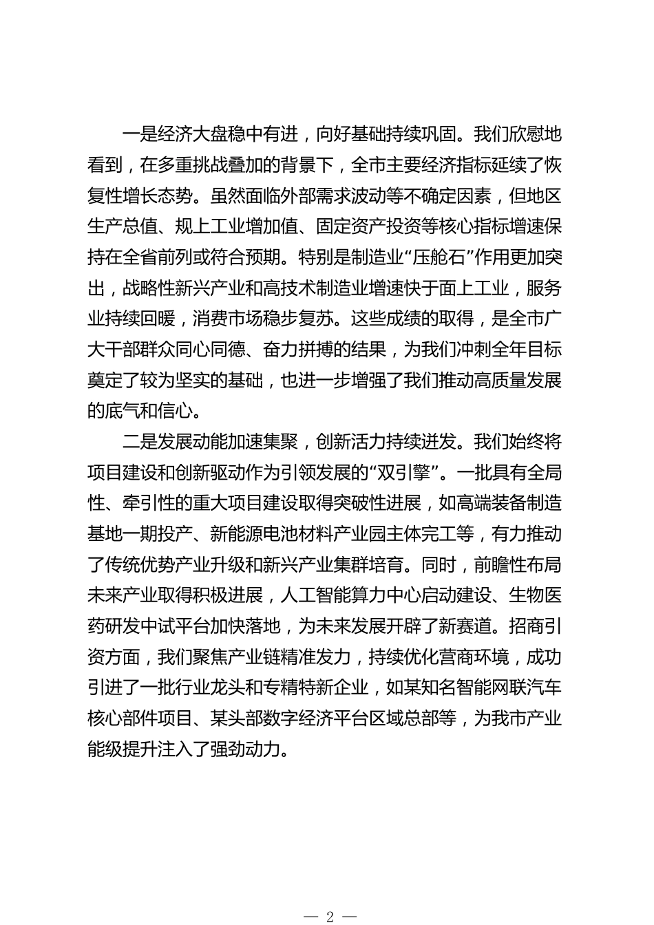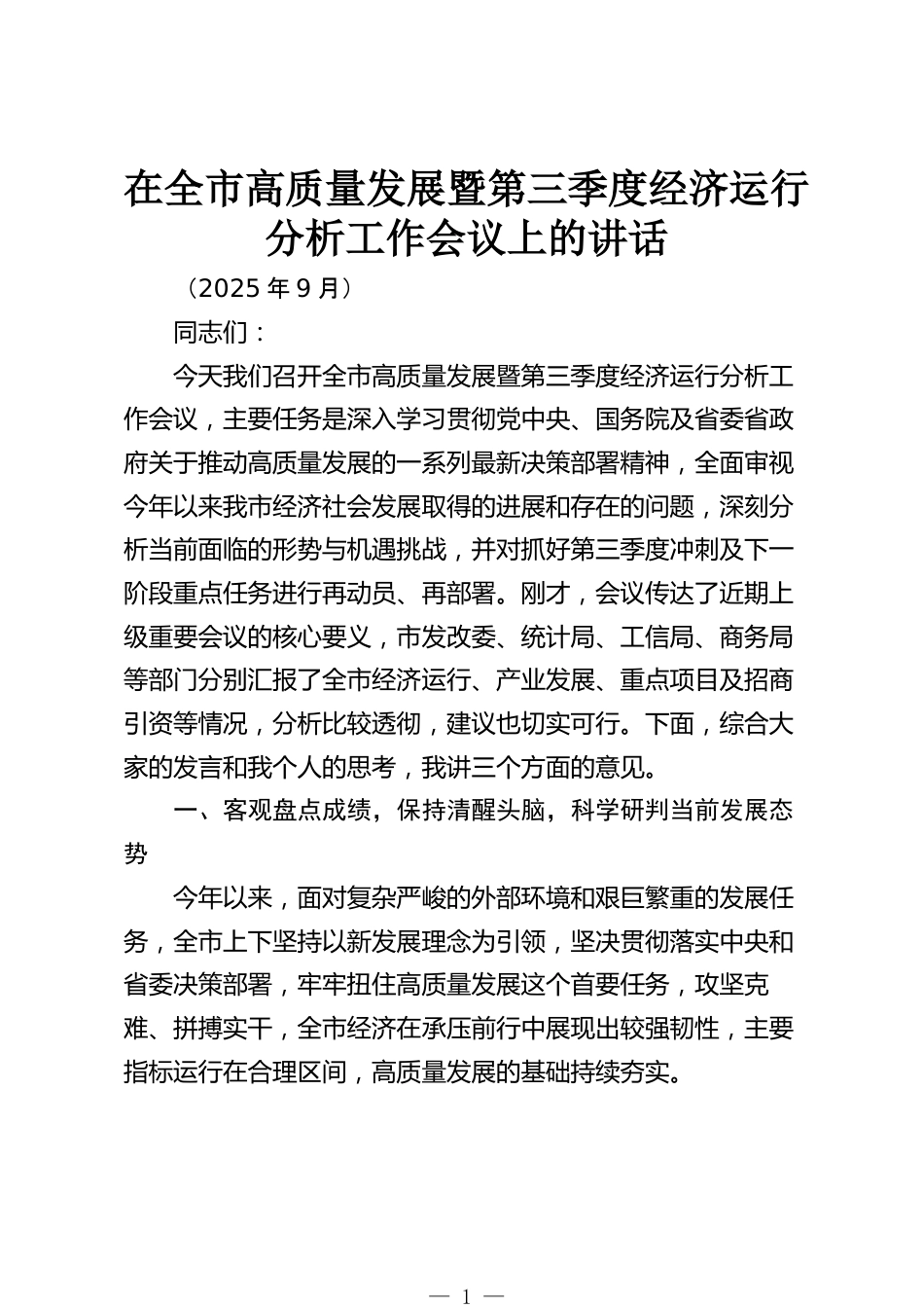 在全市高質(zhì)量發(fā)展暨第三季度經(jīng)濟(jì)運(yùn)行分析工作會議上的講話(2025年9月)同志們:今天我們召開全市高質(zhì)量發(fā)展暨第三季度經(jīng)濟(jì)運(yùn)行分析工作會議,主要任務(wù)是深入學(xué)習(xí)貫徹黨中央、國務(wù)院及省委省政府關(guān)于推動高質(zhì)量發(fā)展的一系列最新決策部署精神,全面審視今年以來我市經(jīng)濟(jì)社會發(fā)展取得的進(jìn)展和存在的問題,深刻分析當(dāng)前面臨的形勢與機(jī)遇挑戰(zhàn),并對抓好第三季度沖刺及下一階段重點(diǎn)任務(wù)進(jìn)行再動員、再部署。剛才,會議傳達(dá)了近期上級重要會議的核心要義,市發(fā)改委、統(tǒng)計(jì)局、工信局、商務(wù)局等部門分別匯報(bào)了全市經(jīng)濟(jì)運(yùn)行、產(chǎn)業(yè)發(fā)展、重點(diǎn)項(xiàng)目及招商引資等情況,分析比較透徹,...