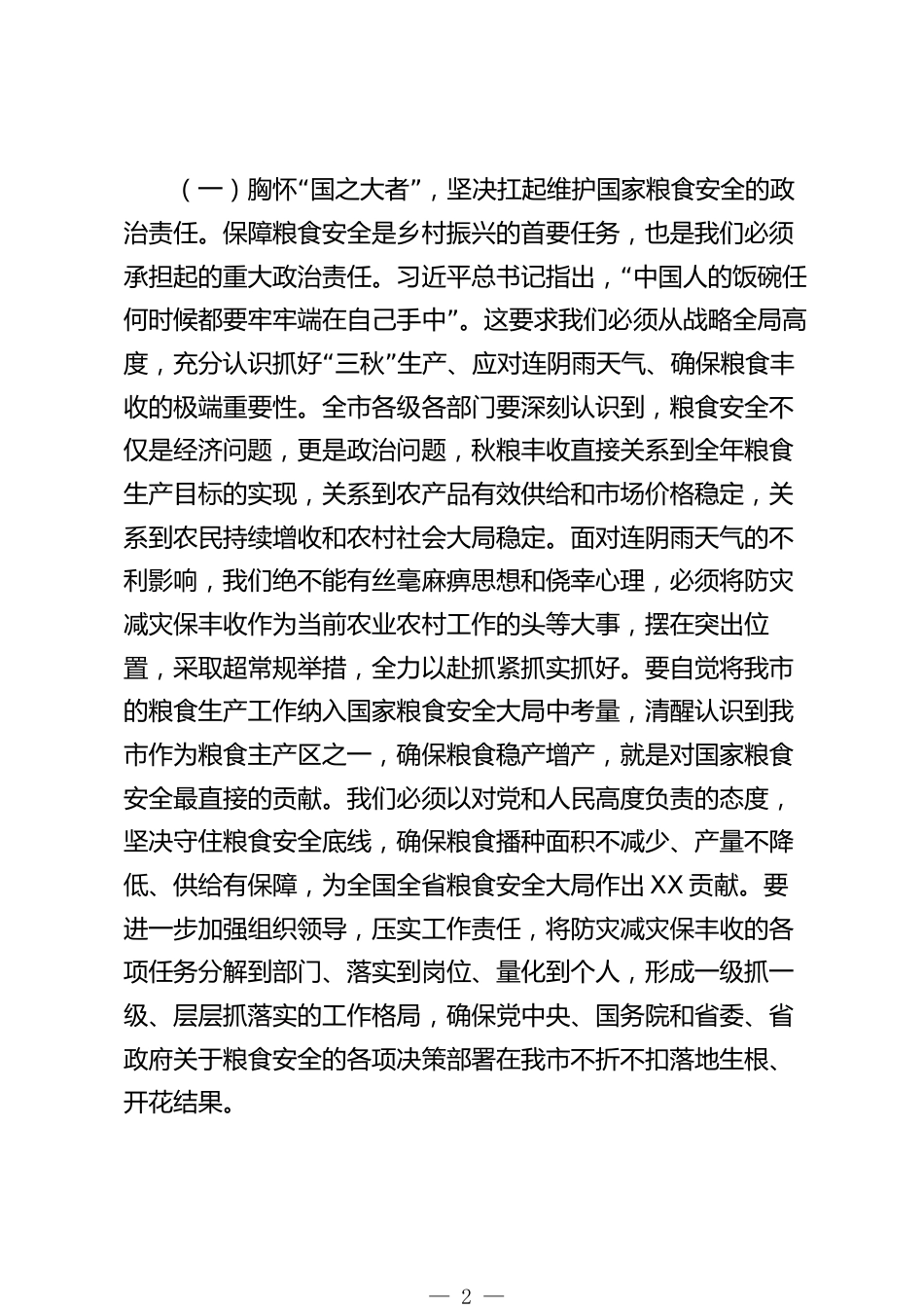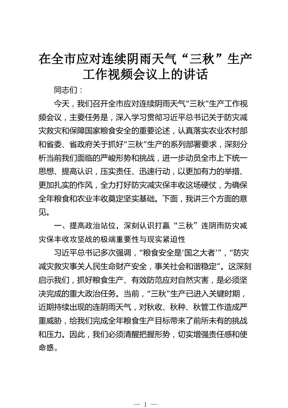 在全市應(yīng)對連續(xù)陰雨天氣“三秋”生產(chǎn)工作視頻會議上的講話同志們:“”今天,我們召開全市應(yīng)對連續(xù)陰雨天氣三秋生產(chǎn)工作視頻會議,主要任務(wù)是,深入學(xué)習(xí)貫徹習(xí)近平總書記關(guān)于防災(zāi)減災(zāi)救災(zāi)和保障國家糧食安全的重要論述,認(rèn)真落實農(nóng)業(yè)農(nóng)村部“”和省委、省政府關(guān)于抓好三秋生產(chǎn)的系列部署要求,深刻分析當(dāng)前我們面臨的嚴(yán)峻形勢和挑戰(zhàn),進一步動員全市上下統(tǒng)一思想、提高認(rèn)識,壓實責(zé)任、迅速行動,以更加有力的舉措、更加扎實的作風(fēng),全力打好防災(zāi)減災(zāi)保豐收這場硬仗,為確保全年糧食和農(nóng)業(yè)豐收奠定堅實基礎(chǔ)。下面,我講三個方面的意見。一、提高政治站位,深刻認(rèn)識打贏“...