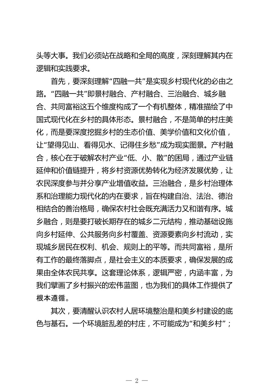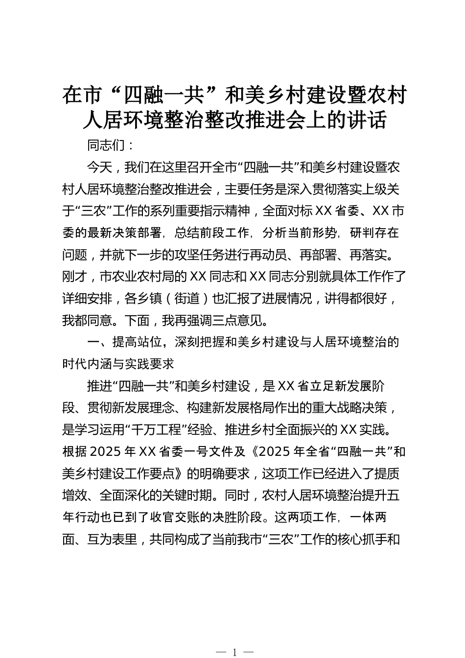 在市“四融一共”和美鄉(xiāng)村建設(shè)暨農(nóng)村人居環(huán)境整治整改推進會上的講話同志們:“”今天,我們在這里召開全市四融一共和美鄉(xiāng)村建設(shè)暨農(nóng)村人居環(huán)境整治整改推進會,主要任務(wù)是深入貫徹落實上級關(guān)“”于三農(nóng)工作的系列重要指示精神,全面對標(biāo)XX省委、XX市委的最新決策部署,前段工作,分析當(dāng)前形,研判存在總結(jié)勢問題,并就下一步的攻堅任務(wù)進行再動員、再部署、再落實。剛才,市農(nóng)業(yè)農(nóng)村局的XX同志和XX同志分別就具體工作作了詳細安排,各鄉(xiāng)鎮(zhèn)(街道)也匯報了進展情況,講得都很好,我都同意。下面,我再強調(diào)三點意見。一、提高站位,深刻把握和美鄉(xiāng)村建設(shè)與人居環(huán)境整治的...