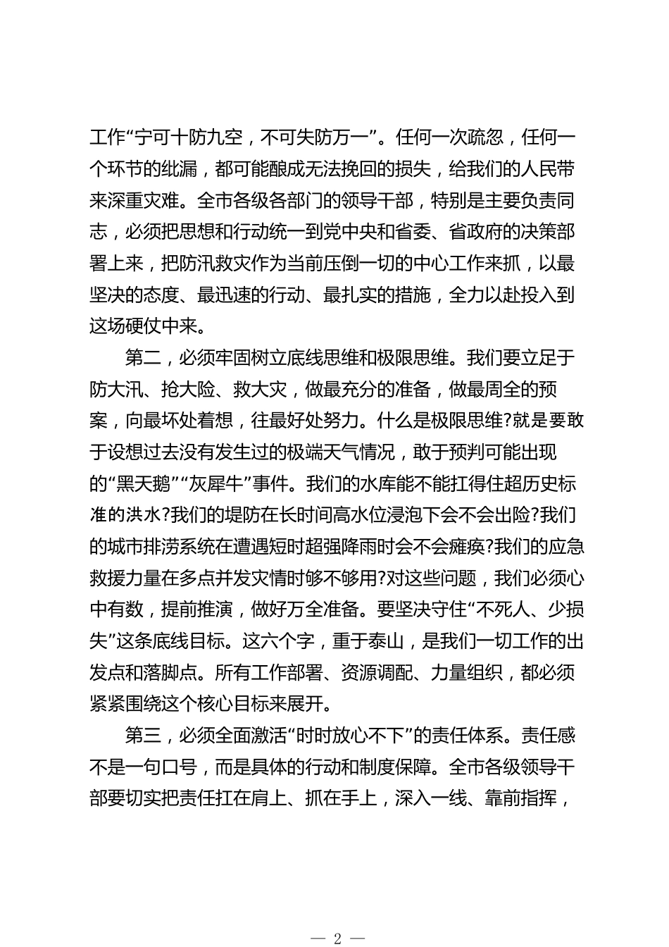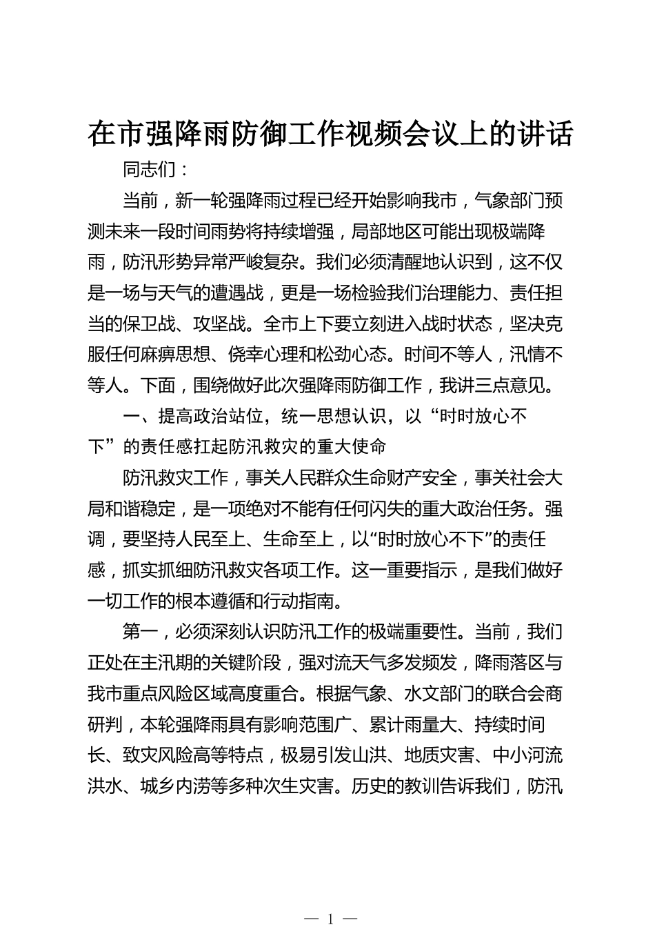 在市強降雨防御工作視頻會議上的講話同志們:當(dāng)前,新一輪強降雨過程已經(jīng)開始影響我市,氣象部門預(yù)測未來一段時間雨勢將持續(xù)增強,局部地區(qū)可能出現(xiàn)極端降雨,防汛形勢異常嚴(yán)峻復(fù)雜。我們必須清醒地認(rèn)識到,這不僅是一場與天氣的遭遇戰(zhàn),更是一場檢驗我們治理能力、責(zé)任擔(dān)當(dāng)?shù)谋Pl(wèi)戰(zhàn)、攻堅戰(zhàn)。全市上下要立刻進入戰(zhàn)時狀態(tài),堅決克服任何麻痹思想、僥幸心理和松勁心態(tài)。時間不等人,汛情不等人。下面,圍繞做好此次強降雨防御工作,我講三點意見。一、提高政治站位,統(tǒng)一思想認(rèn)識,以“時時放心不下”的責(zé)任感扛起防汛救災(zāi)的重大使命防汛救災(zāi)工作,事關(guān)人民群眾生命財產(chǎn)安...