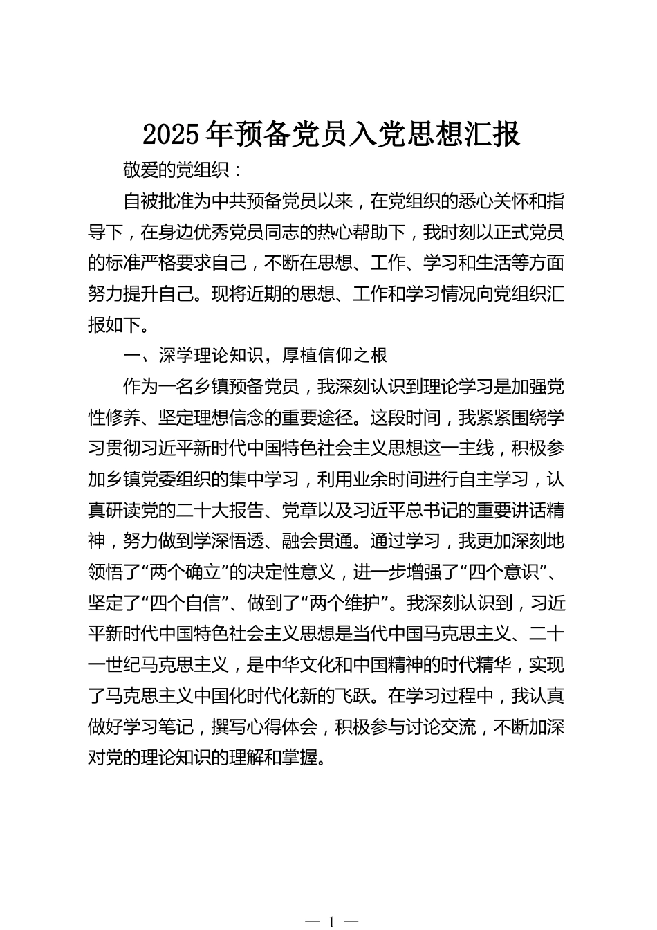 2025年預備黨員入黨思想?yún)R報敬愛的黨組織:自被批準為中共預備黨員以來,在黨組織的悉心關懷和指導下,在身邊優(yōu)秀黨員同志的熱心幫助下,我時刻以正式黨員的標準嚴格要求自己,不斷在思想、工作、學習和生活等方面努力提升自己?,F(xiàn)將近期的思想、工作和學習情況向黨組織匯報如下。一、深學理論知識,厚植信仰之根作為一名鄉(xiāng)鎮(zhèn)預備黨員,我深刻認識到理論學習是加強黨性修養(yǎng)、堅定理想信念的重要途徑。這段時間,我緊緊圍繞學習貫徹習近平新時代中國特色社會主義思想這一主線,積極參加鄉(xiāng)鎮(zhèn)黨委組織的集中學習,利用業(yè)余時間進行自主學習,認真研讀黨的二十大報告、黨章以...
