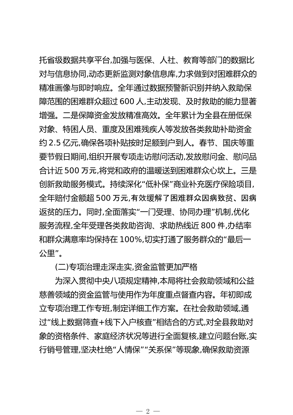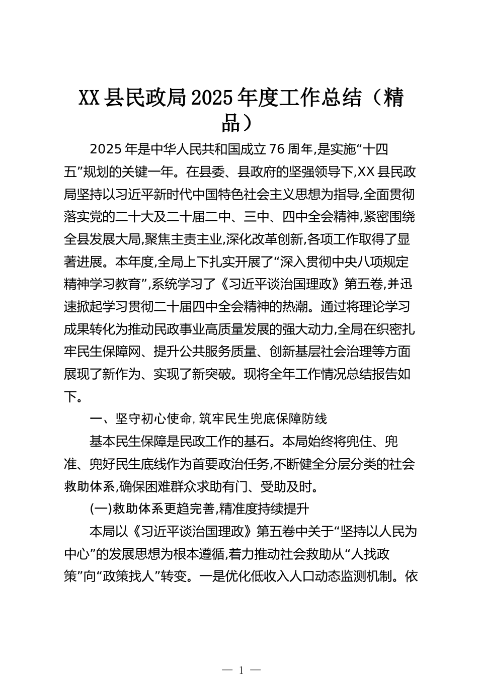 XX縣民政局2025年度工作總結(jié)(精品)2025年是中華人民共和國成立76周年,“是實(shí)施十四”五規(guī)劃的關(guān)鍵一年。在縣委、縣政府的堅(jiān)強(qiáng)領(lǐng)導(dǎo)下,XX縣民政局堅(jiān)持以習(xí)近平新時(shí)代中國特色社會(huì)主義思想為指導(dǎo),全面貫徹落實(shí)黨的二十大及二十屆二中、三中、四中全會(huì)精神,緊密圍繞全縣發(fā)展大局,聚焦主責(zé)主業(yè),深化改革創(chuàng)新,各項(xiàng)工作取得了顯著進(jìn)展。本年度,“全局上下扎實(shí)開展了深入貫徹中央八項(xiàng)規(guī)定”精神學(xué)習(xí)教育,系統(tǒng)學(xué)習(xí)了《習(xí)近平談治國理政》第五卷,并迅速掀起學(xué)習(xí)貫徹二十屆四中全會(huì)精神的熱潮。通過將理論學(xué)習(xí)成果轉(zhuǎn)化為推動(dòng)民政事業(yè)高質(zhì)量發(fā)展的強(qiáng)大動(dòng)力,全局在織密扎牢民生保障...