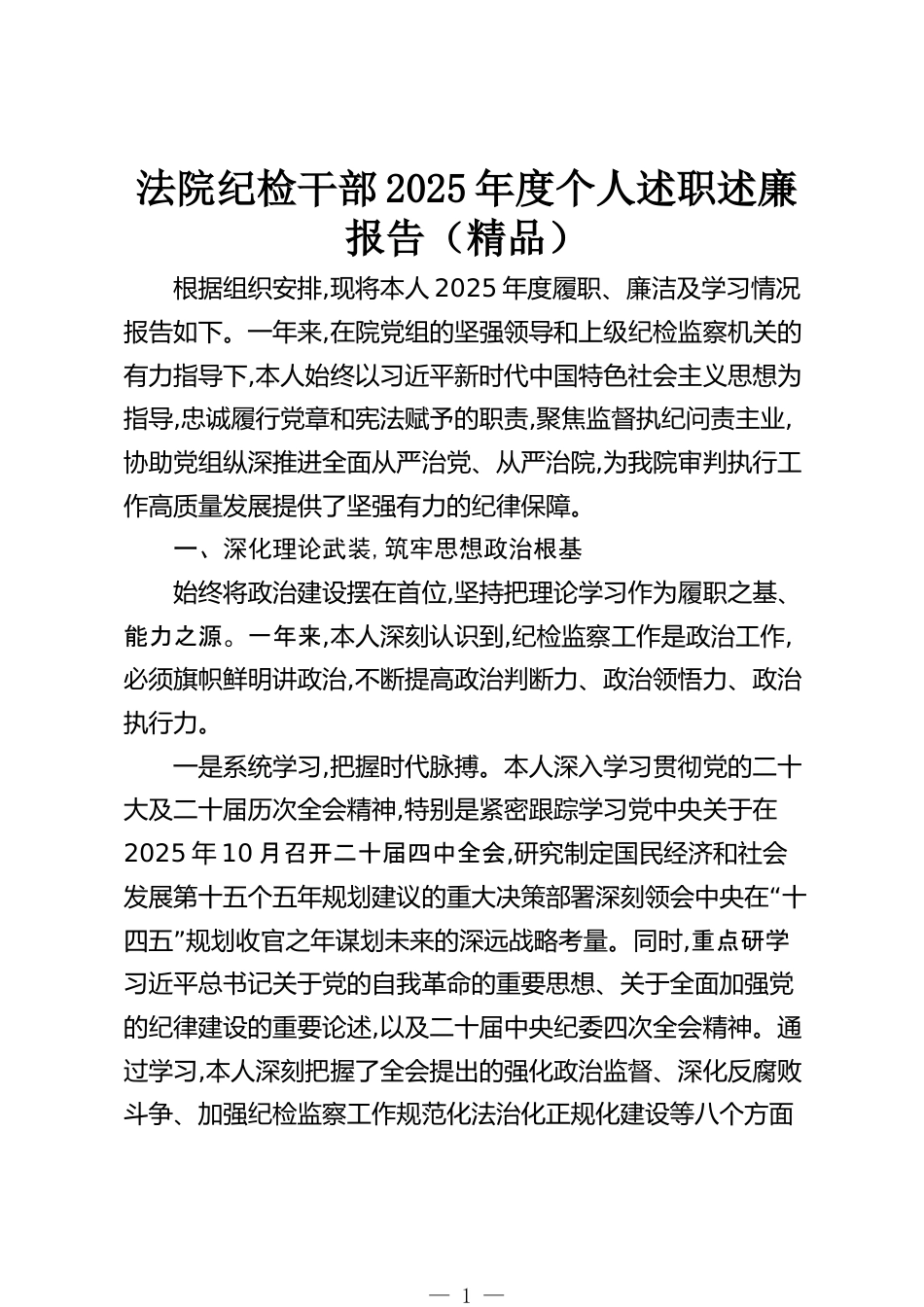法院紀(jì)檢干部2025年度個(gè)人述職述廉報(bào)告(精品)根據(jù)組織安排,現(xiàn)將本人2025年度履職、廉潔及學(xué)習(xí)情況報(bào)告如下。一年來,在院黨組的堅(jiān)強(qiáng)領(lǐng)導(dǎo)和上級(jí)紀(jì)檢監(jiān)察機(jī)關(guān)的有力指導(dǎo)下,本人始終以習(xí)近平新時(shí)代中國特色社會(huì)主義思想為指導(dǎo),忠誠履行黨章和憲法賦予的職責(zé),聚焦監(jiān)督執(zhí)紀(jì)問責(zé)主業(yè),協(xié)助黨組縱深推進(jìn)全面從嚴(yán)治黨、從嚴(yán)治院,為我院審判執(zhí)行工作高質(zhì)量發(fā)展提供了堅(jiān)強(qiáng)有力的紀(jì)律保障。一、深化理論武裝,筑牢思想政治根基始終將政治建設(shè)擺在首位,堅(jiān)持把理論學(xué)習(xí)作為履職之基、能力之源。一年來,本人深刻認(rèn)識(shí)到,紀(jì)檢監(jiān)察工作是政治工作,必須旗幟鮮明講政治,不斷提高政治判斷力、...