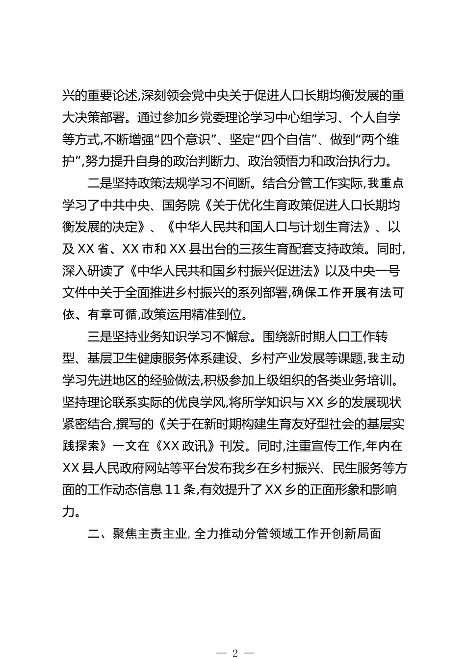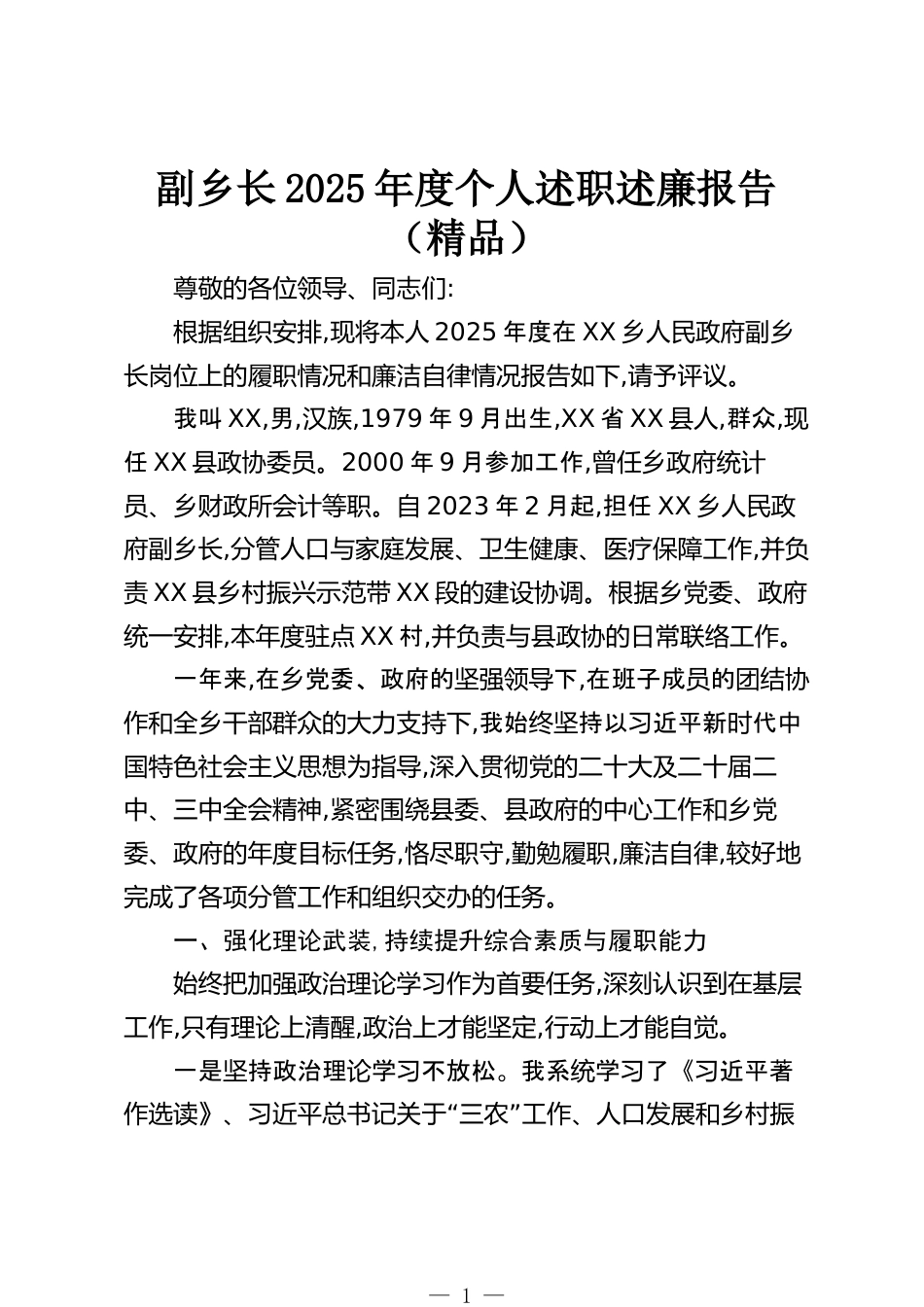 副鄉(xiāng)長2025年度個人述職述廉報告(精品)尊敬的各位領(lǐng)導(dǎo)、同志們:根據(jù)組織安排,現(xiàn)將本人2025年度在XX鄉(xiāng)人民政府副鄉(xiāng)長崗位上的履職情況和廉潔自律情況報告如下,請予評議。我叫XX,男,漢族,1979年9月出生,XX省XX縣人,群眾,現(xiàn)任XX縣政協(xié)委員。2000年9月參加工作,曾任鄉(xiāng)政府統(tǒng)計員、鄉(xiāng)財政所會計等職。自2023年2月起,擔(dān)任XX鄉(xiāng)人民政府副鄉(xiāng)長,分管人口與家庭發(fā)展、衛(wèi)生健康、醫(yī)療保障工作,并負(fù)責(zé)XX縣鄉(xiāng)村振興示范帶XX段的建設(shè)協(xié)調(diào)。根據(jù)鄉(xiāng)黨委、政府統(tǒng)一安排,本年度駐點XX村,并負(fù)責(zé)與縣政協(xié)的日常聯(lián)絡(luò)工作。一年來,在黨委、政府的下鄉(xiāng)堅強領(lǐng)導(dǎo),在班子成員的團結(jié)協(xié)作和全鄉(xiāng)干部...