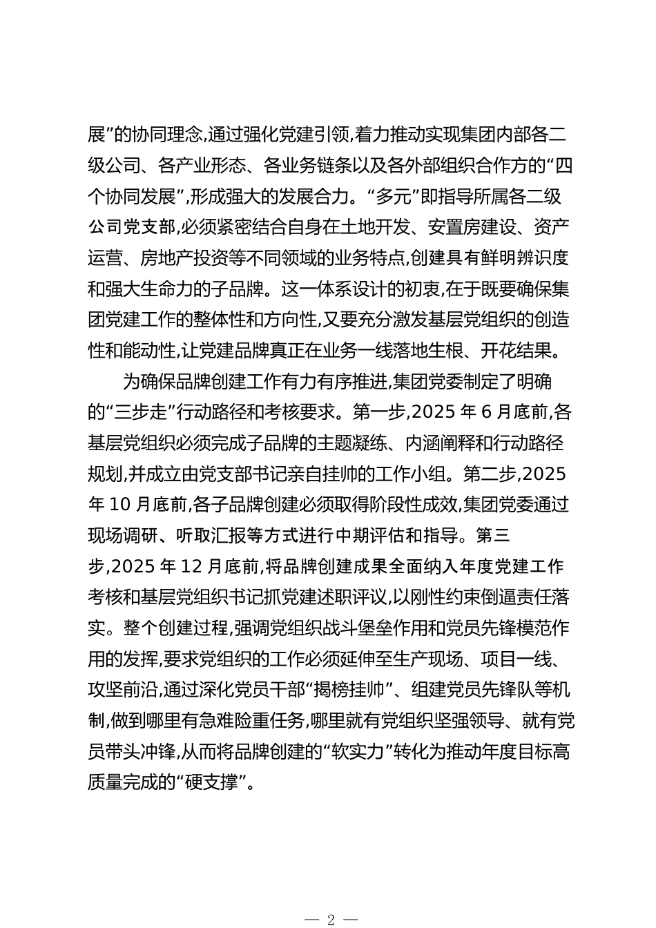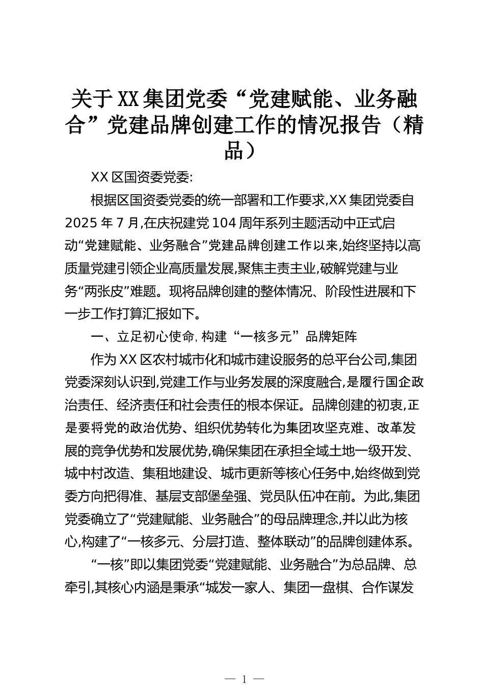 關(guān)于XX集團黨委“黨建賦能、業(yè)務(wù)融合”黨建品牌創(chuàng)建工作的情況報告(精品)XX區(qū)國資委黨委:根據(jù)區(qū)國資委黨委的統(tǒng)一部署和工作要求,XX集團黨委自2025年7月,在慶祝建黨104周年系列主題活動中正式啟“”黨建能、融合黨建品牌建工作以來動賦業(yè)務(wù)創(chuàng),始終堅持以高質(zhì)量黨建引領(lǐng)企業(yè)高質(zhì)量發(fā)展,聚焦主責(zé)主業(yè),破解黨建與業(yè)“”務(wù)兩張皮難題?,F(xiàn)將品牌創(chuàng)建的整體情況、階段性進展和下一步工作打算匯報如下。一、立足初心使命,構(gòu)建“一核多元”品牌矩陣作為XX區(qū)農(nóng)村城市化和城市建設(shè)服務(wù)的總平臺公司,集團黨委深刻認(rèn)識到,黨建工作與業(yè)務(wù)發(fā)展的深度融合,是履行國企政治責(zé)任、經(jīng)濟責(zé)任...