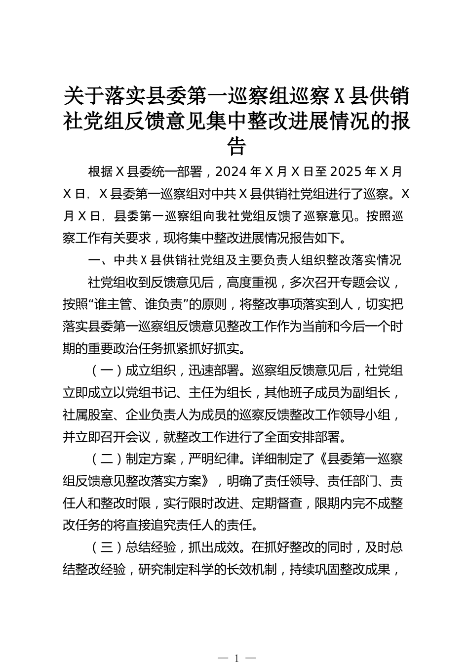 關于落實縣委第一巡察組巡察X縣供銷社黨組反饋意見集中整改進展情況的報告