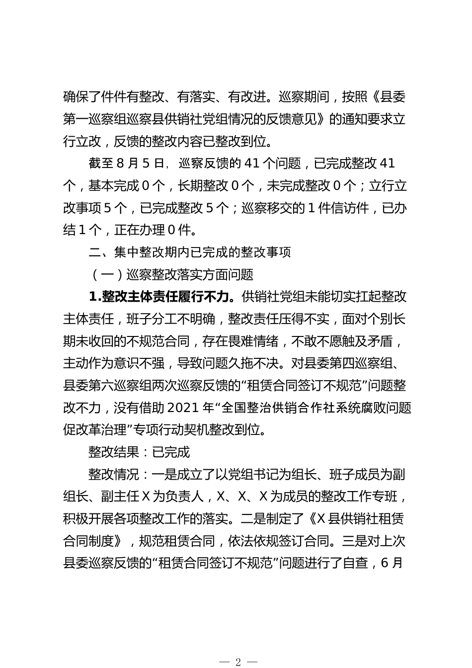 關于落實縣委第一巡察組巡察X縣供銷社黨組反饋意見集中整改進展情況的報告根據X縣委統(tǒng)一部署,2024年X月X日至2025年X月X日,X縣委第一巡察組對中共X縣供銷社黨組進行了巡察。X月X日,委第一巡察向我社黨反了巡察意。按照巡縣組組饋見察工作有關要求,現將集中整改進展情況報告如下。一、中共X縣供銷社黨組及主要負責人組織整改落實情況社黨組收到反饋意見后,高度重視,多次召開專題會議,“”按照誰主管、誰負責的原則,將整改事項落實到人,切實把落實縣委第一巡察組反饋意見整改工作作為當前和今后一個時期的重要政治任務抓緊抓好抓實。(一)成立組織,迅速部署。巡...