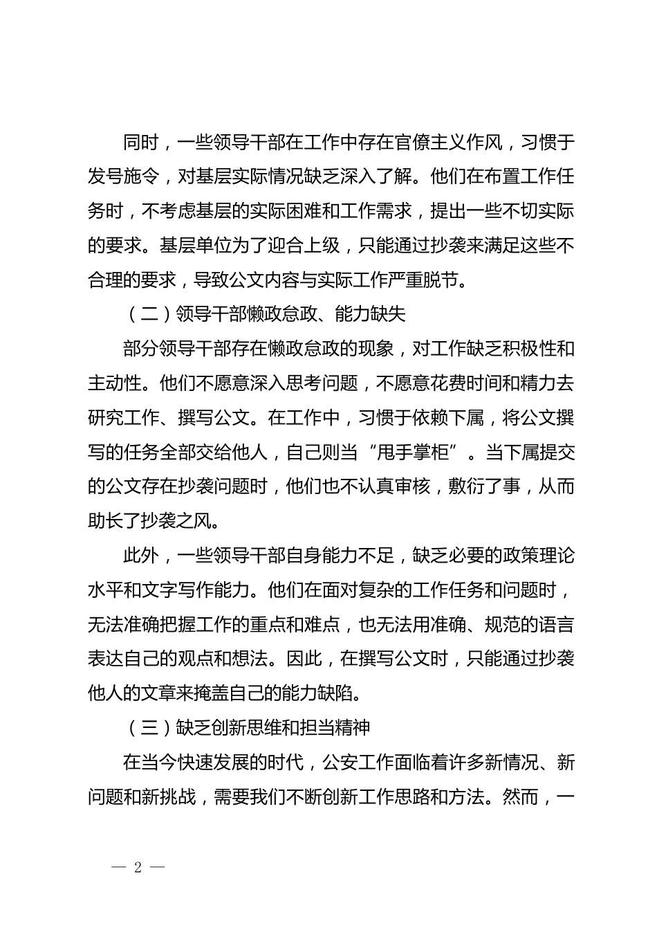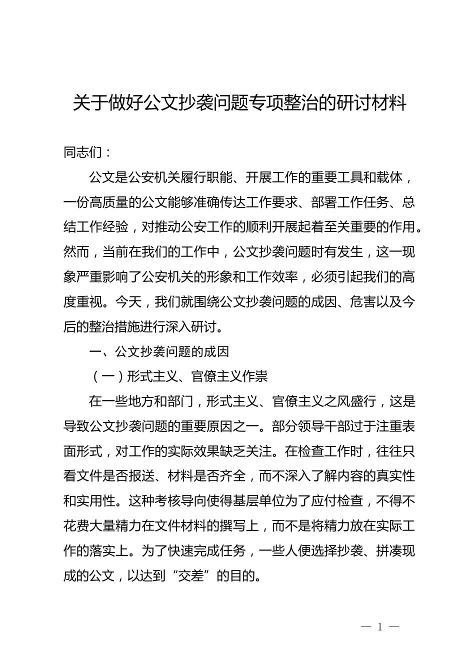 關(guān)于做好公文抄襲問(wèn)題專項(xiàng)整治的研討材料同志們:公文是公安機(jī)關(guān)履行職能、開展工作的重要工具和載體,一份高質(zhì)量的公文能夠準(zhǔn)確傳達(dá)工作要求、部署工作任務(wù)、總結(jié)工作經(jīng)驗(yàn),對(duì)推動(dòng)公安工作的順利開展起著至關(guān)重要的作用。然而,當(dāng)前在我們的工作中,公文抄襲問(wèn)題時(shí)有發(fā)生,這一現(xiàn)象嚴(yán)重影響了公安機(jī)關(guān)的形象和工作效率,必須引起我們的高度重視。今天,我們就圍繞公文抄襲問(wèn)題的成因、危害以及今后的整治措施進(jìn)行深入研討。一、公文抄襲問(wèn)題的成因(一)形式主義、官僚主義作祟在一些地方和部門,形式主義、官僚主義之風(fēng)盛行,這是導(dǎo)致公文抄襲問(wèn)題的重要原因之一。部分...
