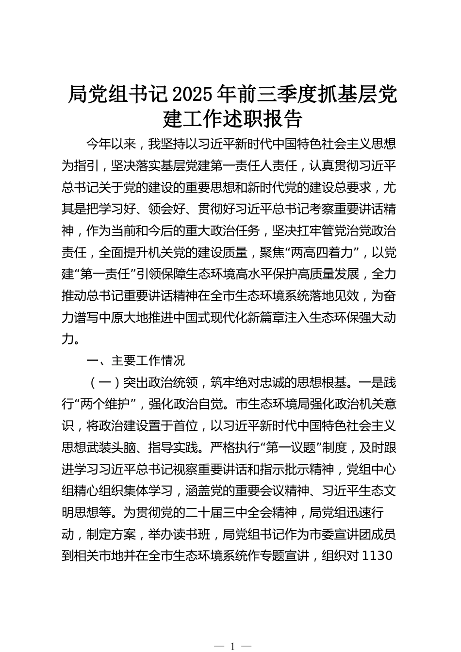 局黨組書記2025年前三季度抓基層黨建工作述職報告