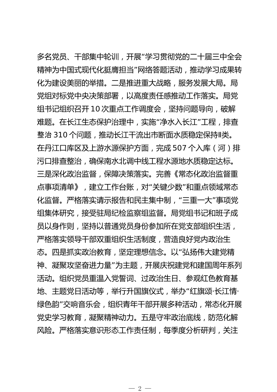 局黨組書記2025年前三季度抓基層黨建工作述職報告今年以來,我堅持以習(xí)近平新時代中國特色社會主義思想為指引,堅決落實基層黨建第一責(zé)任人責(zé)任,認(rèn)真貫徹習(xí)近平總書記關(guān)于黨的建設(shè)的重要思想和新時代黨的建設(shè)總要求,尤其是把學(xué)習(xí)好、領(lǐng)會好、貫徹好習(xí)近平總書記考察重要講話精神,作為當(dāng)前和今后的重大政治任務(wù),堅決扛牢管黨治黨政治“”責(zé)任,全面提升機關(guān)黨的建設(shè)質(zhì)量,聚焦兩高四著力,以黨“”建第一責(zé)任引領(lǐng)保障生態(tài)環(huán)境高水平保護高質(zhì)量發(fā)展,全力推動總書記重要講話精神在全市生態(tài)環(huán)境系統(tǒng)落地見效,為奮力譜寫中原大地推進中國式現(xiàn)代化新篇章注入生態(tài)環(huán)保強大...