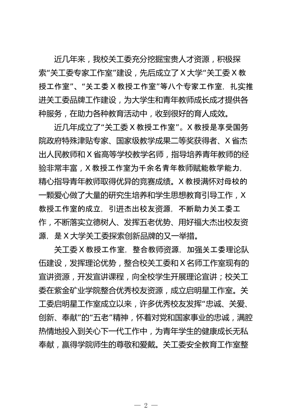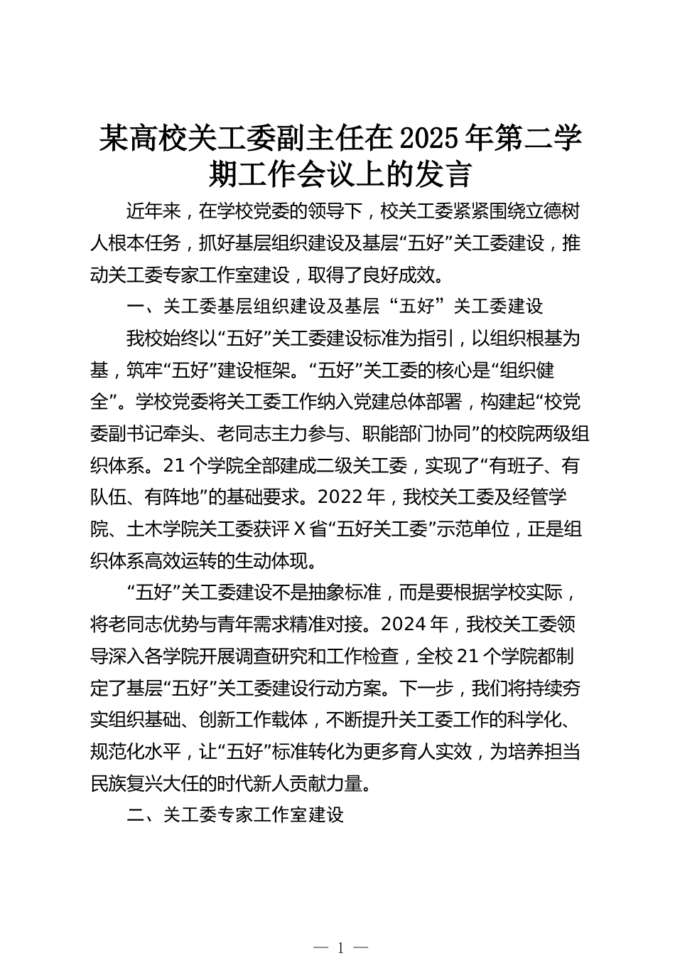某高校關(guān)工委副主任在2025年第二學(xué)期工作會(huì)議上的發(fā)言近年來,在學(xué)校黨委的領(lǐng)導(dǎo)下,校關(guān)工委緊緊圍繞立德樹“”人根本任務(wù),抓好基層組織建設(shè)及基層五好關(guān)工委建設(shè),推動(dòng)關(guān)工委專家工作室建設(shè),取得了良好成效。一、關(guān)工委基層組織建設(shè)及基層“五好”關(guān)工委建設(shè)“”我校始終以五好關(guān)工委建設(shè)標(biāo)準(zhǔn)為指引,以組織根基為“”“”“基,筑牢五好建設(shè)框架。五好關(guān)工委的核心是組織健”“全。學(xué)校黨委將關(guān)工委工作納入黨建總體部署,構(gòu)建起校黨”委副書記牽頭、老同志主力參與、職能部門協(xié)同的校院兩級(jí)組織體系。21“個(gè)學(xué)院全部建成二級(jí)關(guān)工委,實(shí)現(xiàn)了有班子、有”隊(duì)伍、有陣地...