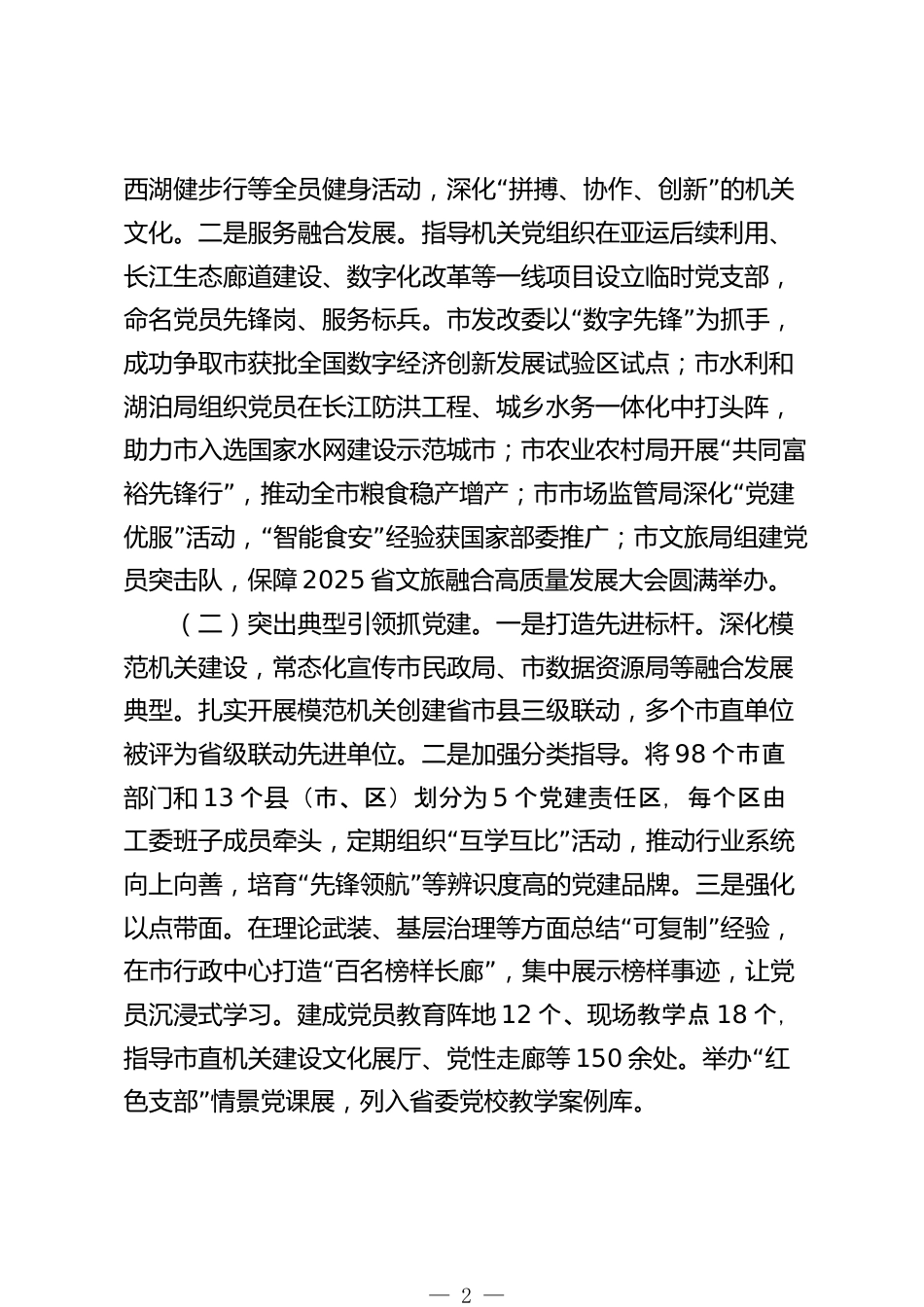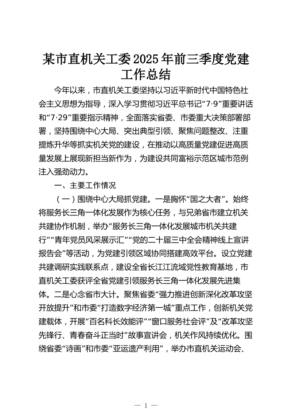 某市直機關(guān)工委2025年前三季度黨建工作總結(jié)今年以來,市直機關(guān)工委堅持以習近平新時代中國特色社“會主義思想為指導,深入學習貫徹習近平總書記7·9”重要講話“和7·29”重要指示精神,全面落實省委、市委重大決策部署部署,堅持圍繞中心大局、突出典型引領(lǐng)、聚焦問題整改、注重提煉升華等抓實機關(guān)黨的建設,在推動以高質(zhì)量黨建促進高質(zhì)量發(fā)展上展現(xiàn)新?lián)斝伦鳛?,為建設共同富裕示范區(qū)城市范例注入強勁動力。一、主要工作情況(一)圍繞中心大局抓黨建?!啊币皇切貞褔笳?。始終將服務長三角一體化發(fā)展作為核心任務,與兄弟省市建立機關(guān)“共建協(xié)作機制,舉辦服務長...