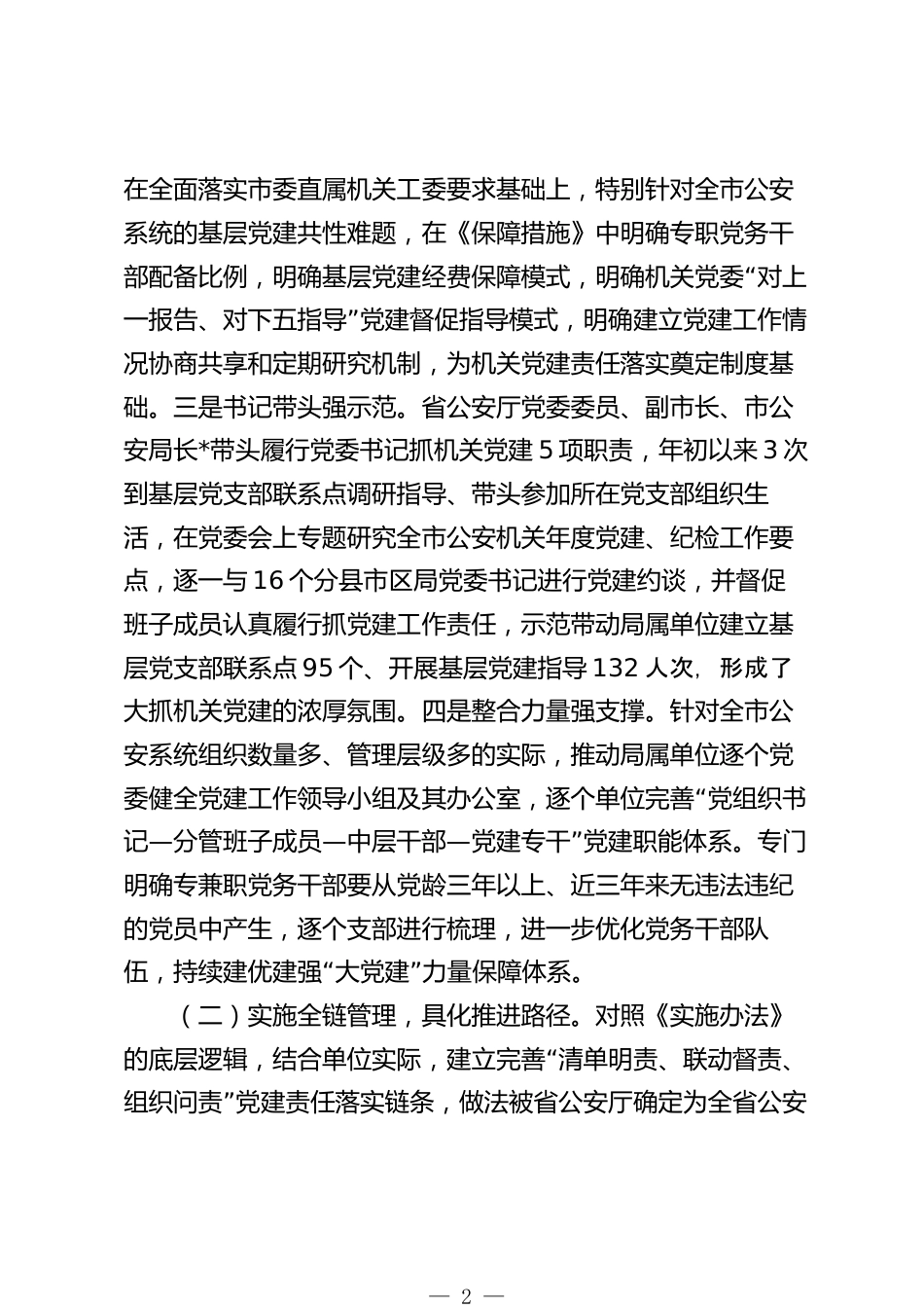 市局黨委2025年前三季度抓基層黨建工作總結(jié)今年以來,市公安局黨委堅持以習(xí)近平新時代中國特色社會主義思想為指引,堅決落實新時代黨的建設(shè)總要求,認真貫“徹市委部署安排,聚焦黨委統(tǒng)籌強保障、全鏈管理促履責(zé)、機”制推進優(yōu)指導(dǎo)、融入融合見成效4個關(guān)鍵環(huán)節(jié),提升站位,以上率下,務(wù)實重干,進一步擰緊機關(guān)黨建責(zé)任鏈條,為以高質(zhì)量機關(guān)黨建促進高質(zhì)量發(fā)展、高效能治理奠定堅實政治基礎(chǔ)。一、主要工作情況(一)加強黨委統(tǒng)籌,匯聚工作合力。“牢固樹立抓好黨建”是本職、不抓黨建是失職、抓不好黨建是不稱職理念,認真履“行抓機關(guān)黨建主體責(zé)任、書記第一責(zé)任和班子...