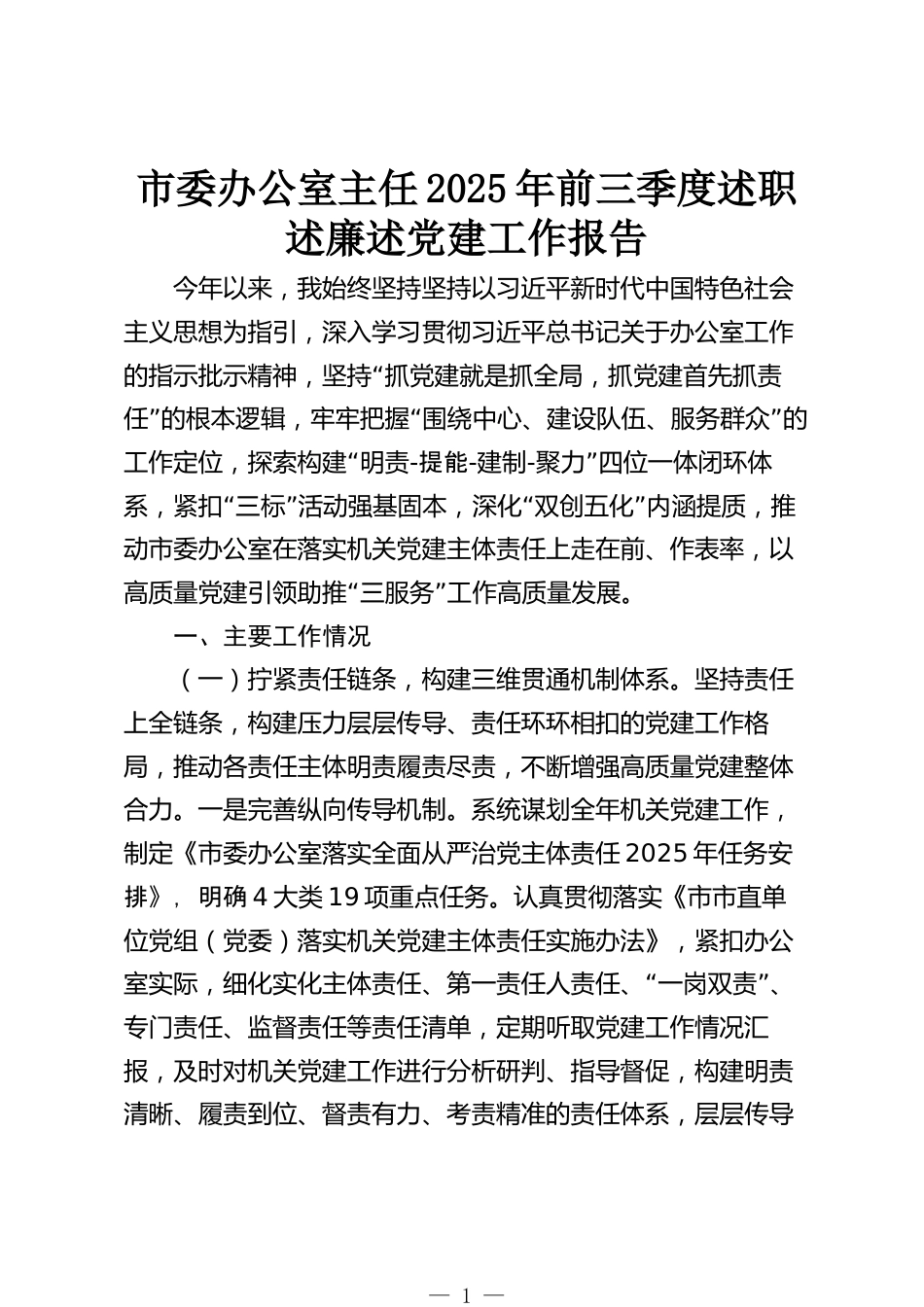 市委辦公室主任2025年前三季度述職述廉述黨建工作報告今年以來,我始終堅持堅持以習近平新時代中國特色社會主義思想為指引,深入學習貫徹習近平總書記關(guān)于辦公室工作“的指示批示精神,堅持抓黨建就是抓全局,抓黨建首先抓責”“”任的根本邏輯,牢牢把握圍繞中心、建設(shè)隊伍、服務(wù)群眾的“工作定位,探索構(gòu)建明責-提能-建制-”聚力四位一體閉環(huán)體“”“”系,緊扣三標活動強基固本,深化雙創(chuàng)五化內(nèi)涵提質(zhì),推動市委辦公室在落實機關(guān)黨建主體責任上走在前、作表率,以“”高質(zhì)量黨建引領(lǐng)助推三服務(wù)工作高質(zhì)量發(fā)展。一、主要工作情況(一)擰緊責任鏈條,構(gòu)建三維貫通機制...