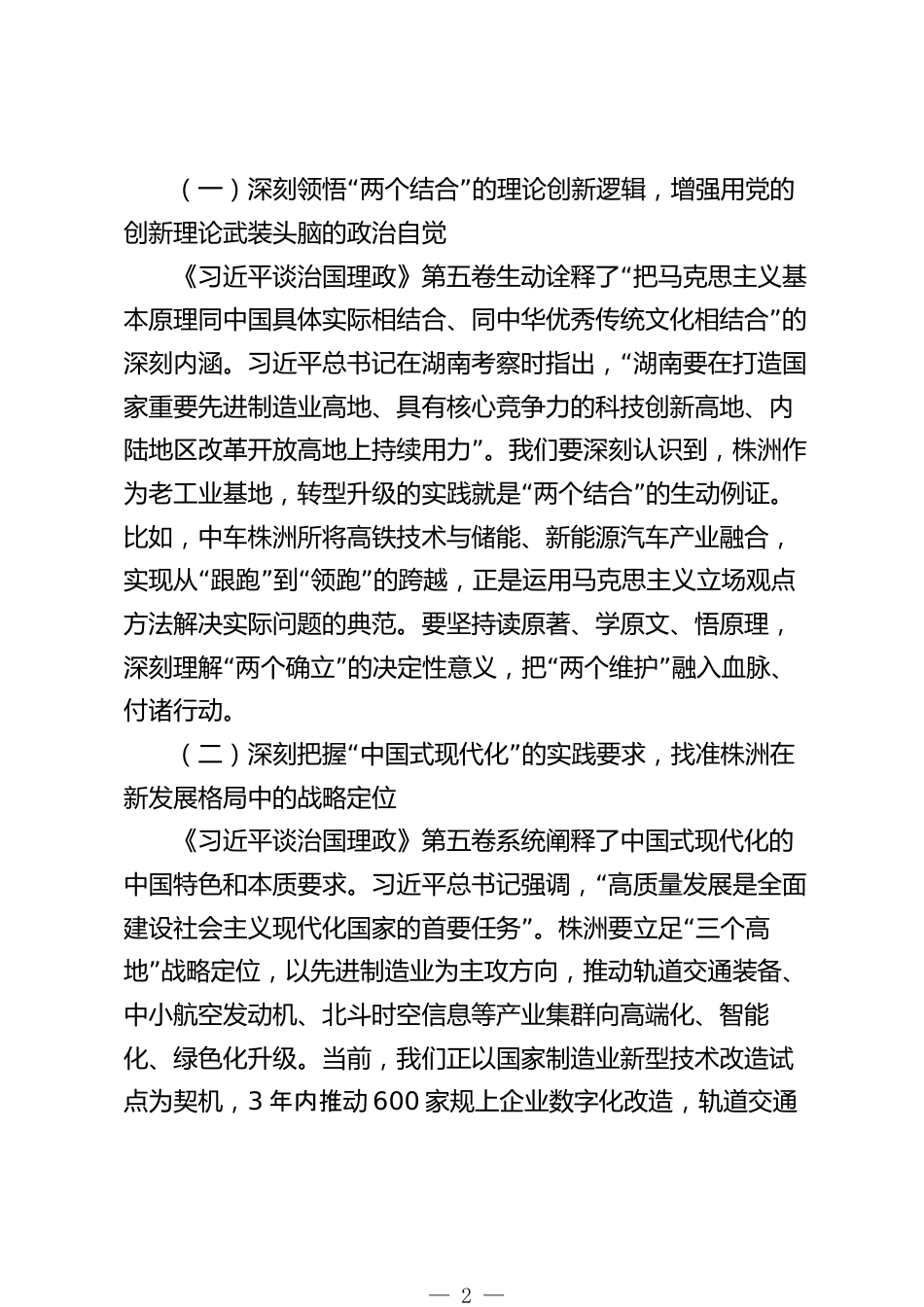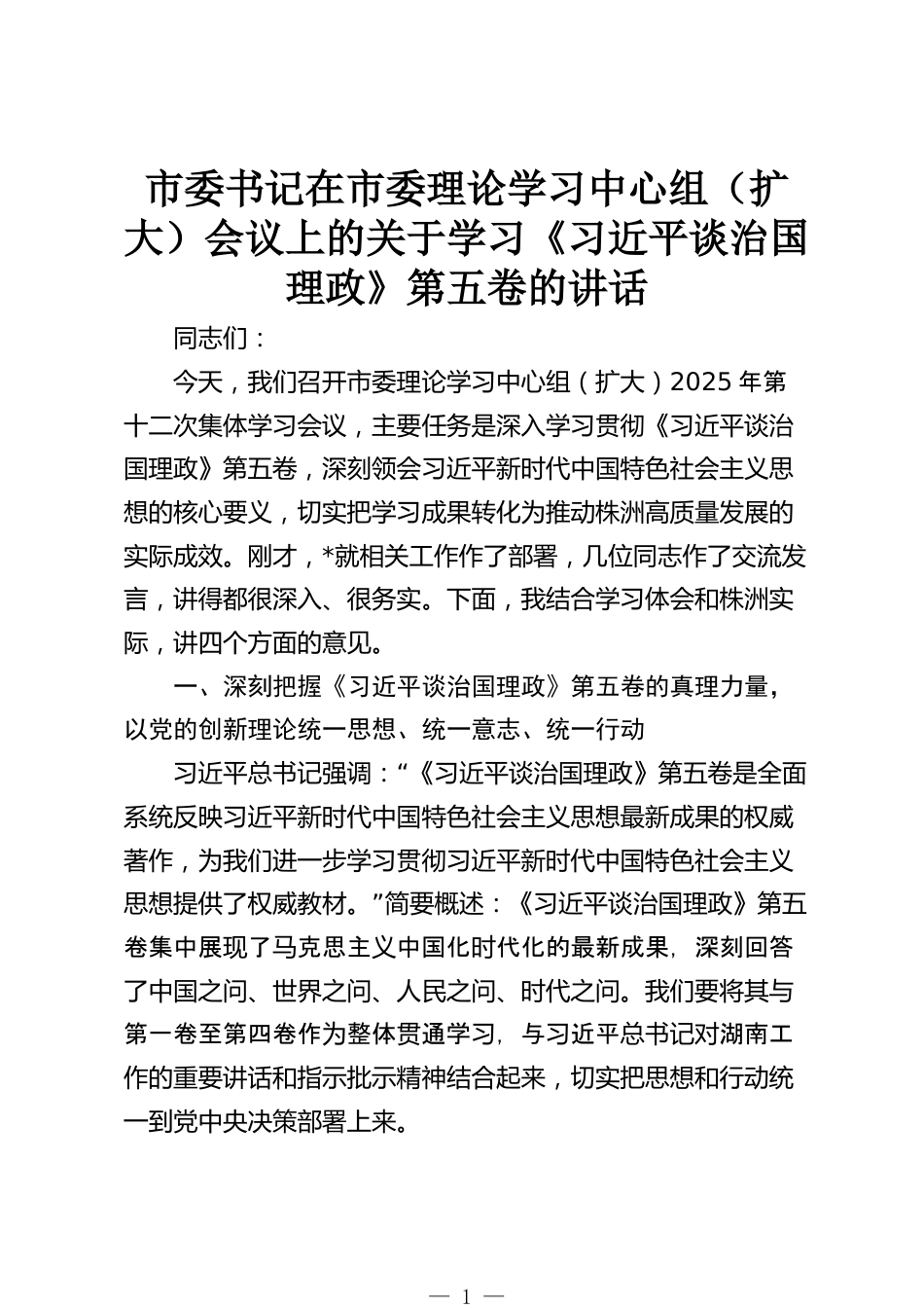 市委書記在市委理論學(xué)習(xí)中心組(擴(kuò)大)會(huì)議上的關(guān)于學(xué)習(xí)《習(xí)近平談治國(guó)理政》第五卷的講話同志們:今天,我們召開市委理論學(xué)習(xí)中心組(擴(kuò)大)2025年第十二次集體學(xué)習(xí)會(huì)議,主要任務(wù)是深入學(xué)習(xí)貫徹《習(xí)近平談治國(guó)理政》第五卷,深刻領(lǐng)會(huì)習(xí)近平新時(shí)代中國(guó)特色社會(huì)主義思想的核心要義,切實(shí)把學(xué)習(xí)成果轉(zhuǎn)化為推動(dòng)株洲高質(zhì)量發(fā)展的實(shí)際成效。剛才,*就相關(guān)工作作了部署,幾位同志作了交流發(fā)言,講得都很深入、很務(wù)實(shí)。下面,我結(jié)合學(xué)習(xí)體會(huì)和株洲實(shí)際,講四個(gè)方面的意見。一、深刻把握《習(xí)近平談治國(guó)理政》第五卷的真理力量,以黨的創(chuàng)新理論統(tǒng)一思想、統(tǒng)一意志、統(tǒng)一行動(dòng)“習(xí)...