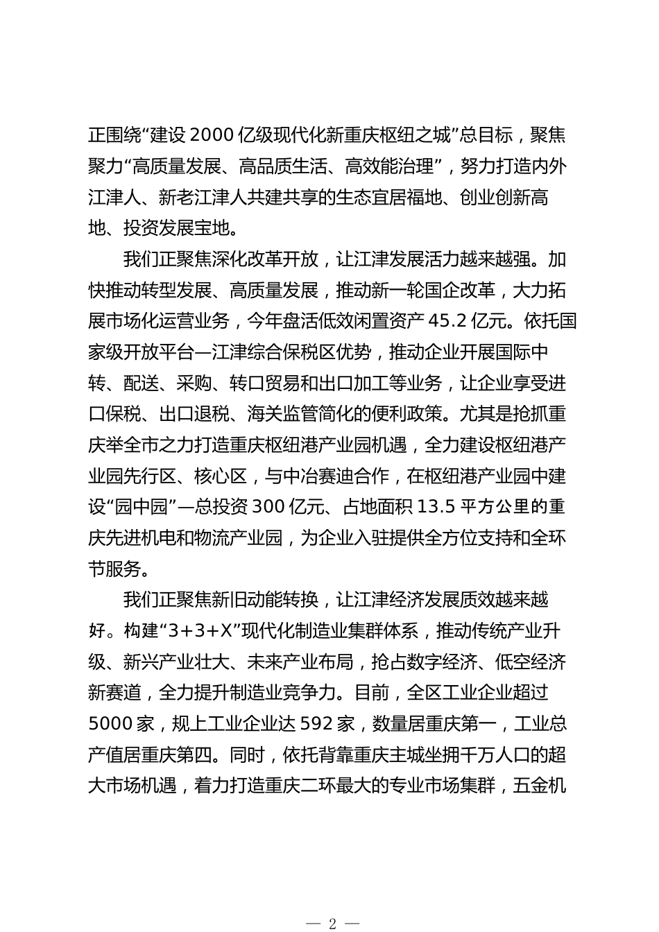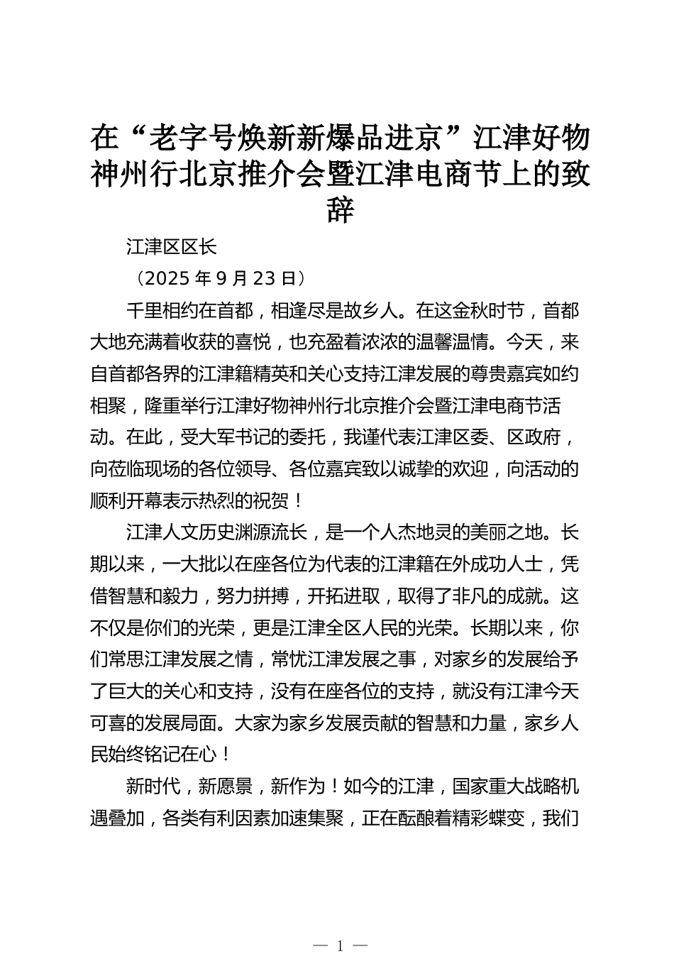 在“老字號煥新新爆品進(jìn)京”江津好物神州行北京推介會暨江津電商節(jié)上的致辭江津區(qū)區(qū)長(2025年9月23日)千里相約在首都,相逢盡是故鄉(xiāng)人。在這金秋時節(jié),首都大地充滿著收獲的喜悅,也充盈著濃濃的溫馨溫情。今天,來自首都各界的江津籍精英和關(guān)心支持江津發(fā)展的尊貴嘉賓如約相聚,隆重舉行江津好物神州行北京推介會暨江津電商節(jié)活動。在此,受大軍書記的委托,我謹(jǐn)代表江津區(qū)委、區(qū)政府,向蒞臨現(xiàn)場的各位領(lǐng)導(dǎo)、各位嘉賓致以誠摯的歡迎,向活動的順利開幕表示熱烈的祝賀!江津人文歷史淵源流長,是一個人杰地靈的美麗之地。長期以來,一大批以在座各位為代表的江津籍在...