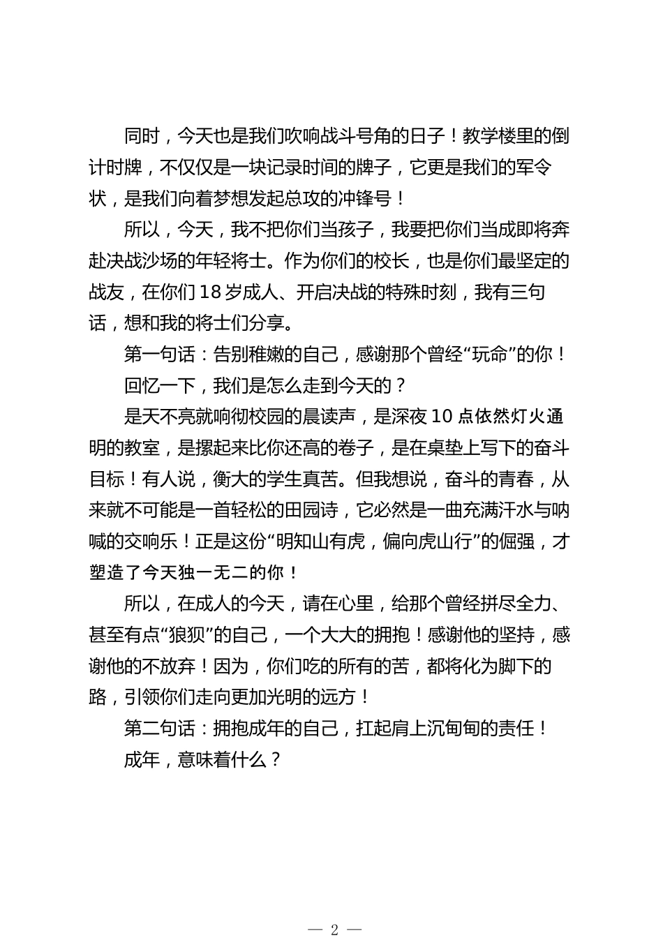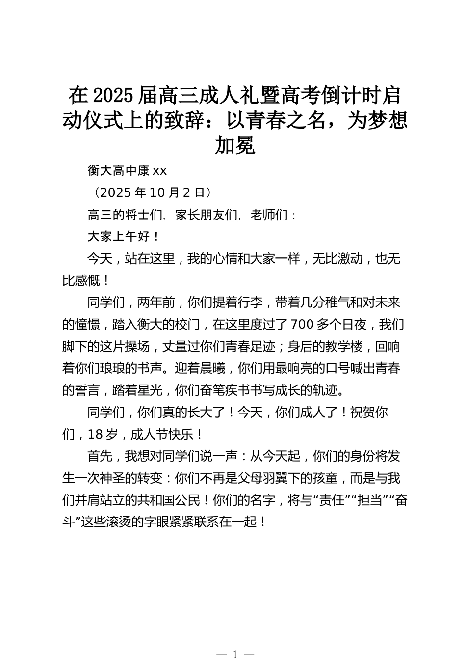 在2025屆高三成人禮暨高考倒計時啟動儀式上的致辭:以青春之名,為夢想加冕衡大高中康xx(2025年10月2日)高三的將士,家朋友,老:們長們師們大家上午好!今天,站在這里,我的心情和大家一樣,無比激動,也無比感慨!同學們,兩年前,你們提著行李,帶著幾分稚氣和對未來的憧憬,踏入衡大的校門,在這里度過了700多個日夜,我們腳下的這片操場,丈量過你們青春足跡;身后的教學樓,回響著你們瑯瑯的書聲。迎著晨曦,你們用最響亮的口號喊出青春的誓言,踏著星光,你們奮筆疾書書寫成長的軌跡。同學們,你們真的長大了!今天,你們成人了!祝賀你們,18歲,成人節(jié)快樂!...
