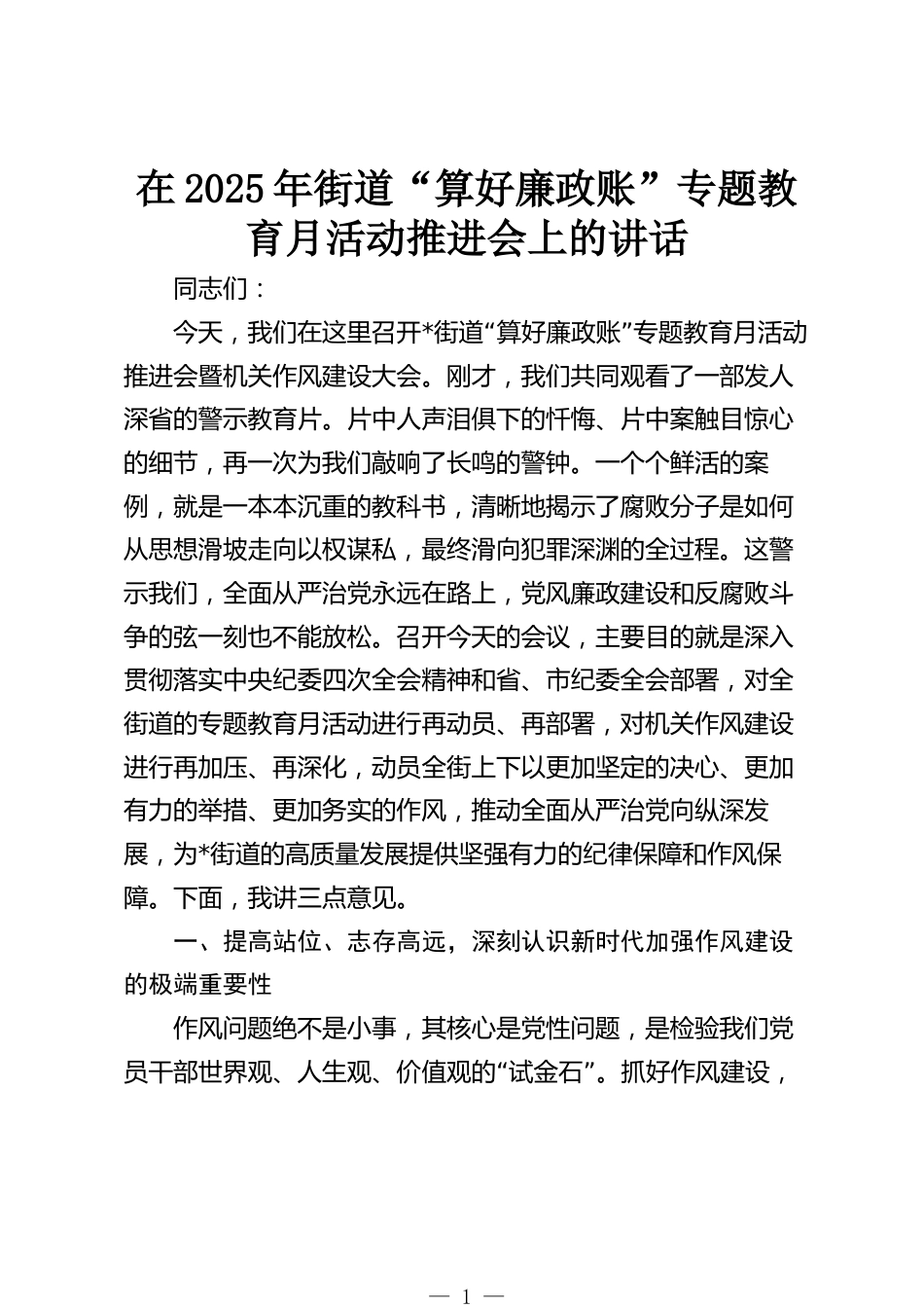在2025年街道“算好廉政賬”專(zhuān)題教育月活動(dòng)推進(jìn)會(huì)上的講話(huà)