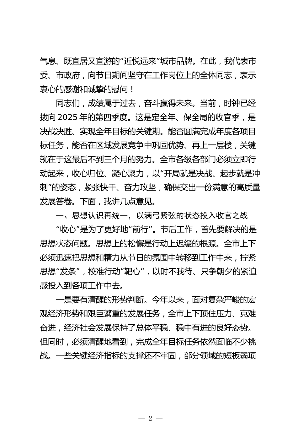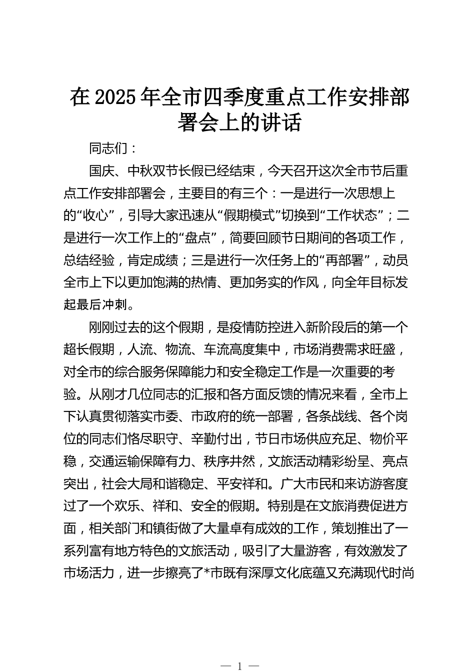 在2025年全市四季度重點工作安排部署會上的講話同志們:國慶、中秋雙節(jié)長假已經(jīng)結(jié)束,今天召開這次全市節(jié)后重點工作安排部署會,主要目的有三個:一是進行一次思想上“”“”“”的收心,引導大家迅速從假期模式切換到工作狀態(tài);二“”是進行一次工作上的盤點,簡要回顧節(jié)日期間的各項工作,“”總結(jié)經(jīng)驗,肯定成績;三是進行一次任務上的再部署,動員全市上下以更加飽滿的熱情、更加務實的作風,向全年目標發(fā)起最后沖刺。剛剛過去的這個假期,是疫情防控進入新階段后的第一個超長假期,人流、物流、車流高度集中,市場消費需求旺盛,對全市的綜合服務保障能力和安全穩(wěn)定...