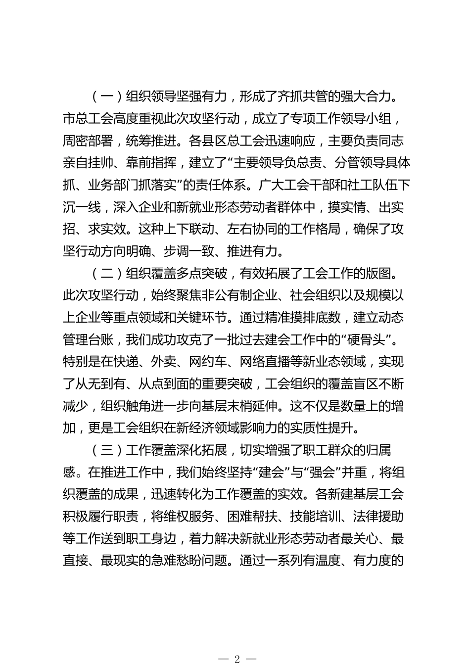 在2025年全市新興領(lǐng)域工會組織“兩個覆蓋”集中攻堅工作推進會議上的講話同志們:“今天,我們在這里召開全市新興領(lǐng)域工會組織兩個覆”蓋集中攻堅工作推進會議,主要任務(wù)是深入學(xué)習(xí)貫徹上級關(guān)于加強新就業(yè)形態(tài)勞動者權(quán)益保障和工會工作的重要指示精神,總結(jié)前一階段集中攻堅的成果與經(jīng)驗,分析當前面臨的形勢與挑戰(zhàn),并對下一階段的重點任務(wù)進行再動員、再部署。這次會議既是一次總結(jié)會、分析會,更是一次加壓鼓勁、決戰(zhàn)決勝的誓師會。下面,我講三點意見。一、回顧過去,成效顯著,基礎(chǔ)堅實“”自全市新興領(lǐng)域工會組織兩個覆蓋集中攻堅行動啟動以來,全市各級工會組織和...