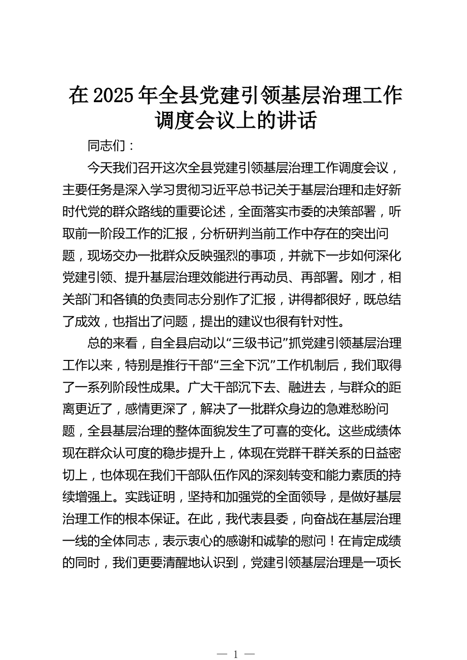 在2025年全縣黨建引領(lǐng)基層治理工作調(diào)度會議上的講話
