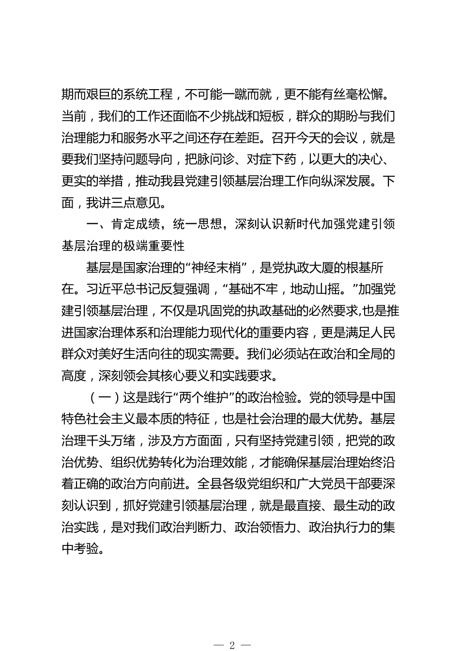 在2025年全縣黨建引領(lǐng)基層治理工作調(diào)度會議上的講話同志們:今天我們召開這次全縣黨建引領(lǐng)基層治理工作調(diào)度會議,主要任務(wù)是深入學(xué)習(xí)貫徹習(xí)近平總書記關(guān)于基層治理和走好新時代黨的群眾路線的重要論述,全面落實市委的決策部署,聽取前一階段工作的匯報,分析研判當前工作中存在的突出問題,現(xiàn)場交辦一批群眾反映強烈的事項,并就下一步如何深化黨建引領(lǐng)、提升基層治理效能進行再動員、再部署。剛才,相關(guān)部門和各鎮(zhèn)的負責同志分別作了匯報,講得都很好,既總結(jié)了成效,也指出了問題,提出的建議也很有針對性。“”總的來看,自全縣啟動以三級書記抓黨建引領(lǐng)基層治理“”...
