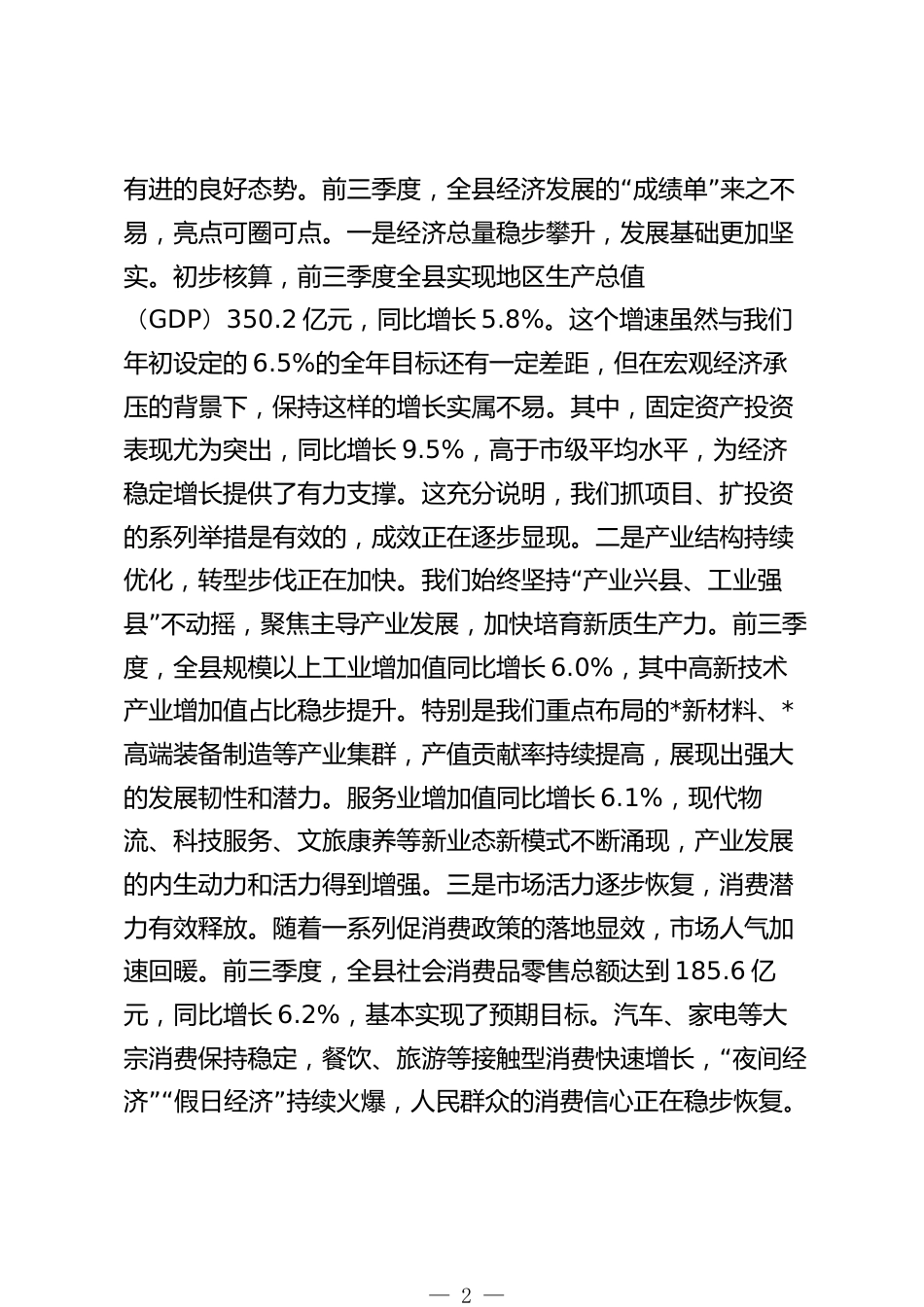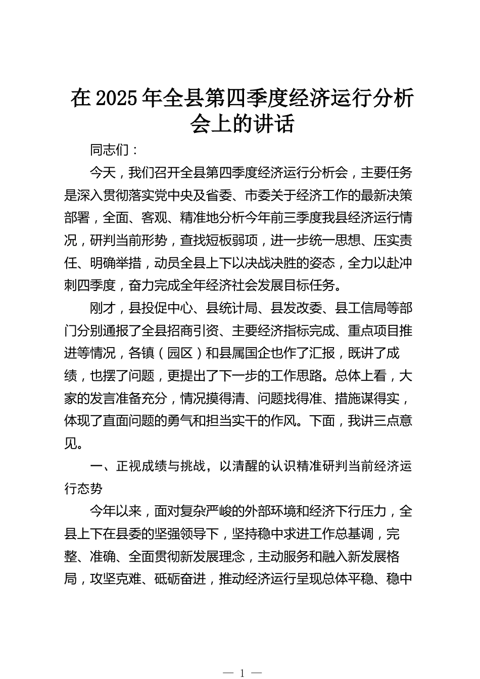 在2025年全縣第四季度經(jīng)濟(jì)運(yùn)行分析會上的講話同志們:今天,我們召開全縣第四季度經(jīng)濟(jì)運(yùn)行分析會,主要任務(wù)是深入貫徹落實黨中央及省委、市委關(guān)于經(jīng)濟(jì)工作的最新決策部署,全面、客觀、精準(zhǔn)地分析今年前三季度我縣經(jīng)濟(jì)運(yùn)行情況,研判當(dāng)前形勢,查找短板弱項,進(jìn)一步統(tǒng)一思想、壓實責(zé)任、明確舉措,動員全縣上下以決戰(zhàn)決勝的姿態(tài),全力以赴沖刺四季度,奮力完成全年經(jīng)濟(jì)社會發(fā)展目標(biāo)任務(wù)。剛才,縣投促中心、縣統(tǒng)計局、縣發(fā)改委、縣工信局等部門分別通報了全縣招商引資、主要經(jīng)濟(jì)指標(biāo)完成、重點(diǎn)項目推進(jìn)等情況,各鎮(zhèn)(園區(qū))和縣屬國企也作了匯報,既講了成績,也擺了問題...