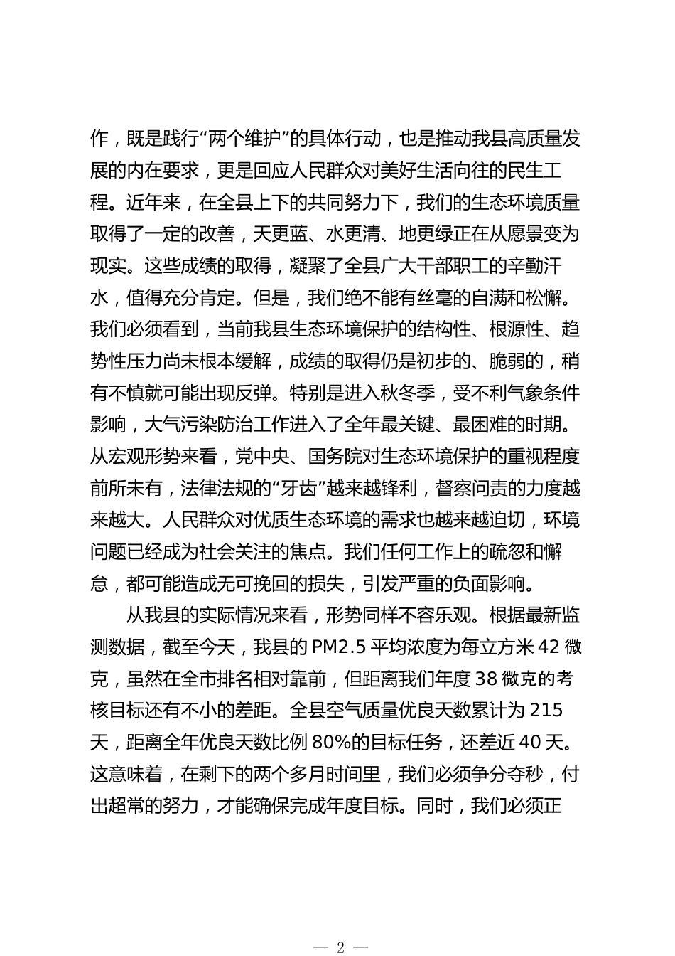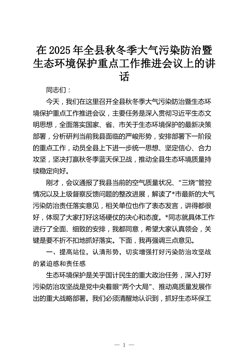 在2025年全縣秋冬季大氣污染防治暨生態(tài)環(huán)境保護(hù)重點(diǎn)工作推進(jìn)會(huì)議上的講話